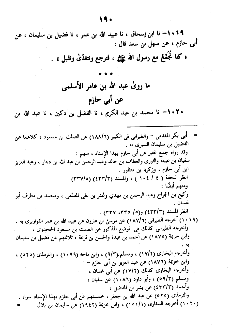 1020 - نَا مُحَمَّدُ بْنُ عَبْدِ الْكَرِيمِ، نَا الْفَضْلُ بْنُ دُكَيْنٍ , نَا عَبْدُ اللَّهِ بْنُ عَامِرٍ , عَنْ أَبِي حَازِمٍ , عَنْ سَهْلِ بْنِ سَعْدٍ السَّاعِدِيِّ قَالَ: «§كُنْتُ أَتَسَحَّرُ فِي أَهْلِي ثُمَّ تَكُونُ سُرْعَتِي أَنْ أُدْرِكَ الصَّلَاةَ فِي مَسْجِدِ رَسُولِ اللَّهِ صَلَّى اللهُ عَلَيْهِ وَسَلَّمَ»