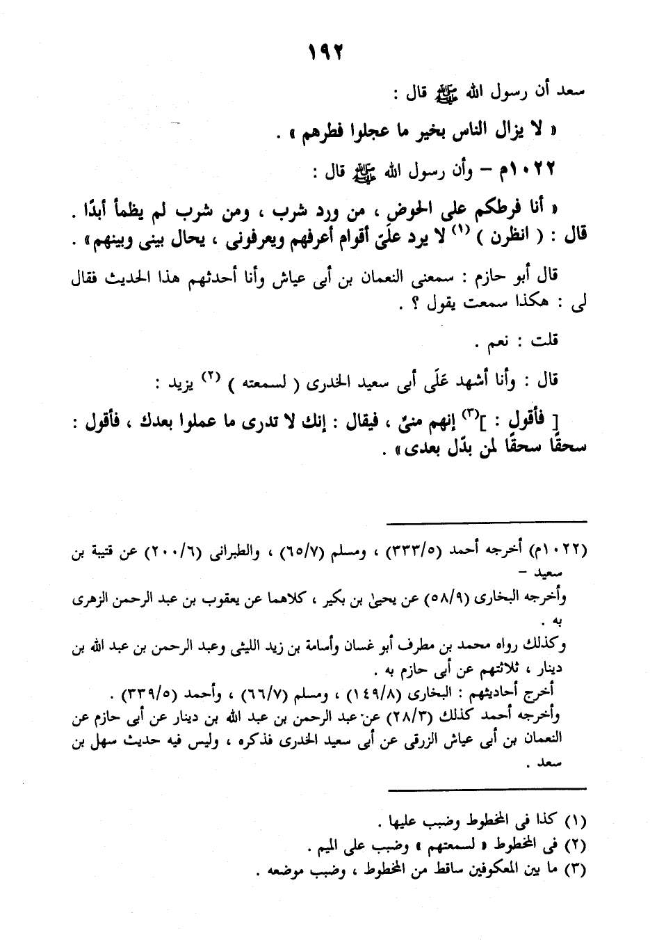 وَأَنَّ رَسُولَ اللَّهِ صَلَّى اللهُ عَلَيْهِ وَسَلَّمَ قَالَ: «§أَنَا فَرَطُكُمْ عَلَى الْحَوْضِ مَنْ وَرَدَ شَرِبَ، وَمَنْ شَرِبَ لَمْ يَظْمَأْ أَبَدًا» قَالَ: انْظُرْنَ لَا يَرِدُ عَلَيَّ أَقْوَامٌ أَعْرِفُهُمْ، وَيَعْرِفُونِي يُحَالُ بَيْنِي وَبَيْنَهُمْ " قَالَ أَبُو حَازِمٍ: سَمِعَنِي النُّعْمَانُ بْنُ أَبِي عَيَّاشٍ وَأَنَا أُحَدِّثُهُمْ هَذَا الْحَدِيثَ، فَقَالَ لِي: هَكَذَا سَمِعْتَ يَقُولُ؟، قُلْتُ: نَعَمْ، قَالَ: وَأَنَا أَشْهَدُ عَلَى أَبِي سَعِيدٍ الْخُدْرِيِّ لَسَمِعْتُهُ يَزِيدُ: " فَأَقُولُ: إِنَّهُمْ مِنِّي، فَيُقَالُ: إِنَّكَ لَا تَدْرِي مَا عَمِلُوا بَعْدَكَ. فَأَقُولُ: «سُحْقًا، سُحْقًا لِمَنْ بَدَّلَ بَعْدِي»