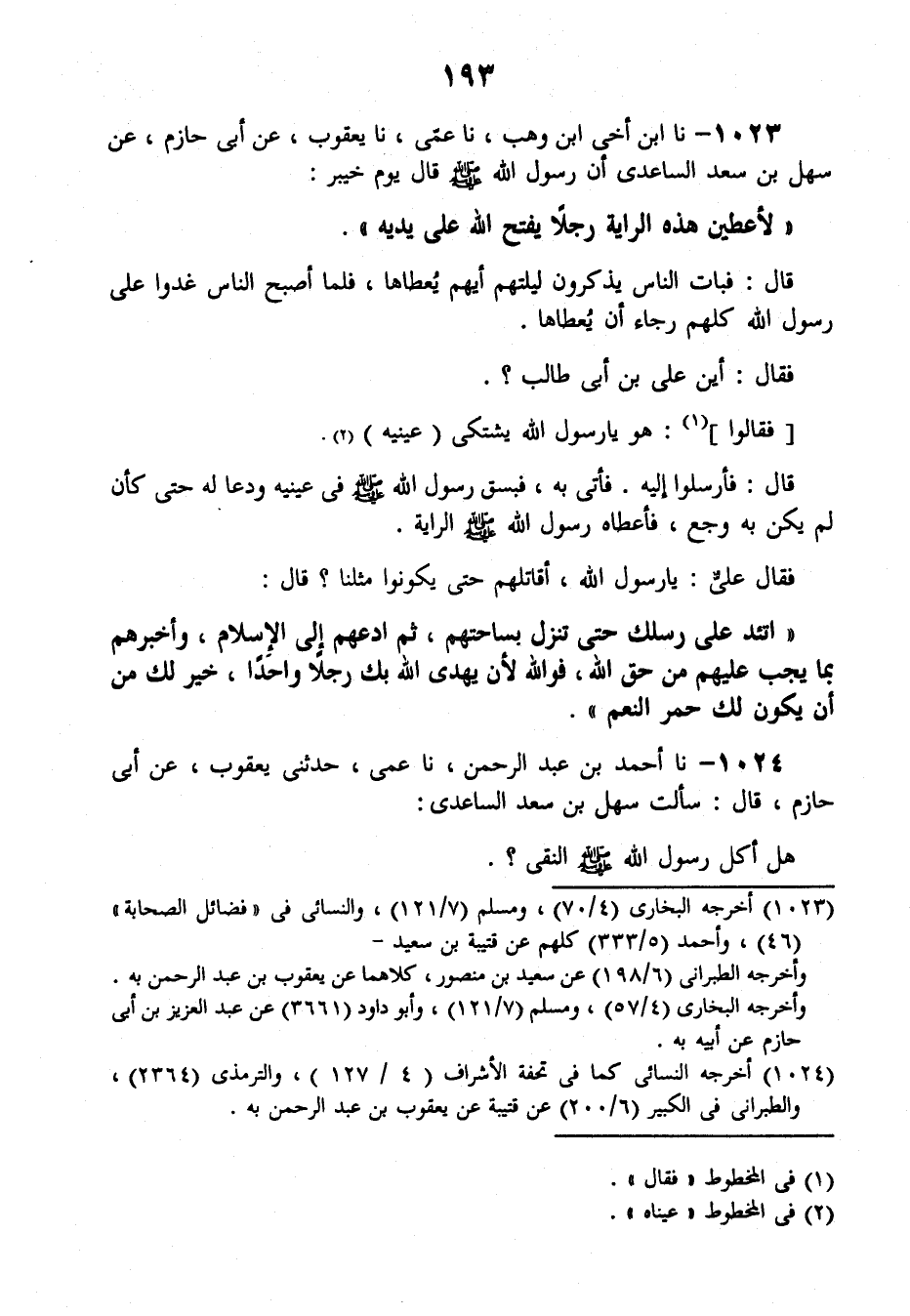 1023 - نَا ابْنُ أَخِي ابْنِ وَهْبٍ، نَا عَمِّي، نَا يَعْقُوبُ، عَنْ أَبِي حَازِمٍ , عَنْ سَهْلِ بْنِ سَعْدٍ السَّاعِدِيِّ أَنَّ رَسُولَ اللَّهِ صَلَّى اللهُ عَلَيْهِ وَسَلَّمَ قَالَ يَوْمَ خَيْبَرَ: «§لَأُعْطِيَنَّ هَذِهِ الرَّايَةَ رَجُلًا يَفْتَحُ اللَّهُ عَلَى يَدَيْهِ» ، قَالَ: فَبَاتَ النَّاسُ يَذْكُرُونَ لَيْلَتَهُمْ أَيُّهُمْ يُعْطَاهَا؟، فَلَمَّا أَصْبَحَ النَّاسُ غَدَوْا عَلَى رَسُولِ اللَّهِ كُلُّهُمْ رَجَاءَ أَنْ يُعْطَاهَا، فَقَالَ: «أَيْنَ عَلِيُّ بْنُ أَبِي طَالِبٍ؟» ، فَقَالُوا: هُوَ يَا رَسُولَ اللَّهِ يَشْتَكِي عَيْنَيْهِ، قَالَ: «فَأَرْسِلُوا إِلَيْهِ» . فَأُتِيَ بِهِ فَبَصَقَ رَسُولُ اللَّهِ صَلَّى اللهُ عَلَيْهِ وَسَلَّمَ فِي عَيْنَيْهِ وَدَعَا لَهُ حَتَّى كَأَنْ لَمْ يَكُنْ بِهِ وَجَعٌ، فَأَعْطَاهُ رَسُولُ اللَّهِ صَلَّى اللهُ عَلَيْهِ وَسَلَّمَ الرَّايَةَ، فَقَالَ عَلِيٌّ: يَا رَسُولَ اللَّهِ، أُقَاتِلُهُمْ حَتَّى يَكُونُوا مِثْلَنَا؟، قَال: «اتَّئِدْ عَلَى رِسْلِكَ حَتَّى تَنْزِلَ بِسَاحَتِهِمْ، ثُمَّ ادْعُهُمْ إِلَى الْإِسْلَامِ وَأَخْبِرْهُمْ بِمَا يَجِبُ عَلَيْهِمْ مِنْ حَقِّ اللَّهِ، فَوَاللَّهِ لَأَنْ يَهْدِي اللَّهُ بِكَ رَجُلًا وَاحِدًا خَيْرٌ لَكَ مِنْ أَنْ يَكُونَ لَكَ حُمْرُ النَّعَمِ»