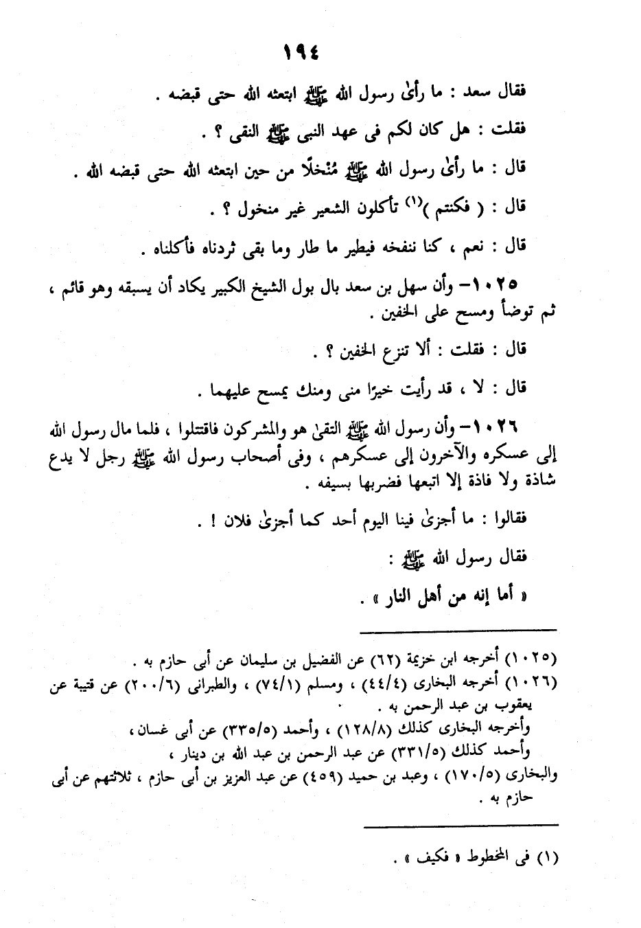 1026 - وَأَنَّ رَسُولَ اللَّهِ صَلَّى اللهُ عَلَيْهِ وَسَلَّمَ الْتَقَى هُوَ وَالْمُشْرِكُونَ فَاقْتَتَلُوا، فَلَمَّا مَالَ رَسُولُ اللَّهِ إِلَى عَسْكَرِهِ، وَالْآخَرُونَ إِلَى عَسْكَرِهِمْ وَفِي أَصْحَابِ رَسُولِ اللَّهِ صَلَّى اللهُ عَلَيْهِ وَسَلَّمَ رَجُلٌ لَا يَدَعُ شَاذَّةً وَلَا فَاذَّةً إِلَّا اتَّبَعَهَا فَضَرَبَهَا بِسَيْفِهِ، فَقَالُوا: مَا أَجْزَى فِينَا الْيَوْمَ أَحَدٌ كَمَا أَجْزَى فُلَانٌ، فَقَالَ رَسُولُ اللَّهِ صَلَّى اللهُ عَلَيْهِ وَسَلَّمَ: «أَمَا إِنَّهُ مِنْ أَهْلِ النَّارِ» -[195]-، فَقَالَ رَجُلٌ مِنَ الْقَوْمِ: أَنَا صَاحِبُهُ، وَاللَّهِ لَا يَمُوتُ عَلَى هَذَا رِجَالٌ، قَالَ: فَخَرَجَ مَعَهُ كُلَّمَا وَقَفَ وَقَفَ مَعَهُ، وَإِذَا أَسْرَعَ أَسْرَعَ مَعَهُ، قَالَ: فَجُرِحُ جِرَاحًا شَدِيدًا، فَاسْتَعْجَلَ الْمَوْتَ فَوَضَعَ نَصْلَ سَيْفِهِ بِالْأَرْضِ وَذُبَابَتَهُ بَيْنَ كَتِفَيْهِ حَتَّى تَحَامَلَ عَلَى سَيْفٍ فَقَتَلَ نَفْسَهُ، فَخَرَجَ الرَّجُلُ إِلَى النَّبِيِّ صَلَّى اللهُ عَلَيْهِ وَسَلَّمَ فَقَالَ: أَشْهَدُ أَنَّكَ رَسُولُ اللَّهِ، قَالَ: «وَمَا ذَاكَ؟» ، قَالَ: الرَّجُلُ الَّذِي ذَكَرْتَ آنِفًا أَنَّهُ مِنْ أَهْلِ النَّارِ أَعْظَمَ النَّاسُ ذَلِكَ، فَقُلْتُ: أَنَا لَكُمْ بِهِ، فَخَرَجْتُ فِي طَلَبِهِ حَتَّى جُرِحَ جُرْحًا شَدِيدًا، فَاسْتَعْجَلَ الْمَوْتَ فَوَضَعَ سَيْفَهُ بِالْأَرْضِ وَذُبَابَتَهُ بَيْنَ كَتِفَيْهِ، ثُمَّ تَحَامَلَ عَلَيْهِ فَقَتَلَ نَفْسَهُ، فَقَالَ عِنْدَ ذَلِكَ رَسُولُ اللَّهِ صَلَّى اللهُ عَلَيْهِ وَسَلَّمَ: «إِنَّ §الرَّجُلَ لَيَعْمَلُ بِعَمَلِ أَهْلِ الْجَنَّةِ فِيمَا يَبْدُو لِلنَّاسِ، وَهُوَ مِنْ أَهْلِ النَّارِ، وَإِنَّ الرَّجُلَ لَيَعْمَلُ عَمَلَ أَهْلِ النَّارِ فِيمَا يَبْدُو لِلنَّاسِ وَهُوَ مِنْ أَهْلِ الْجَنَّةِ»