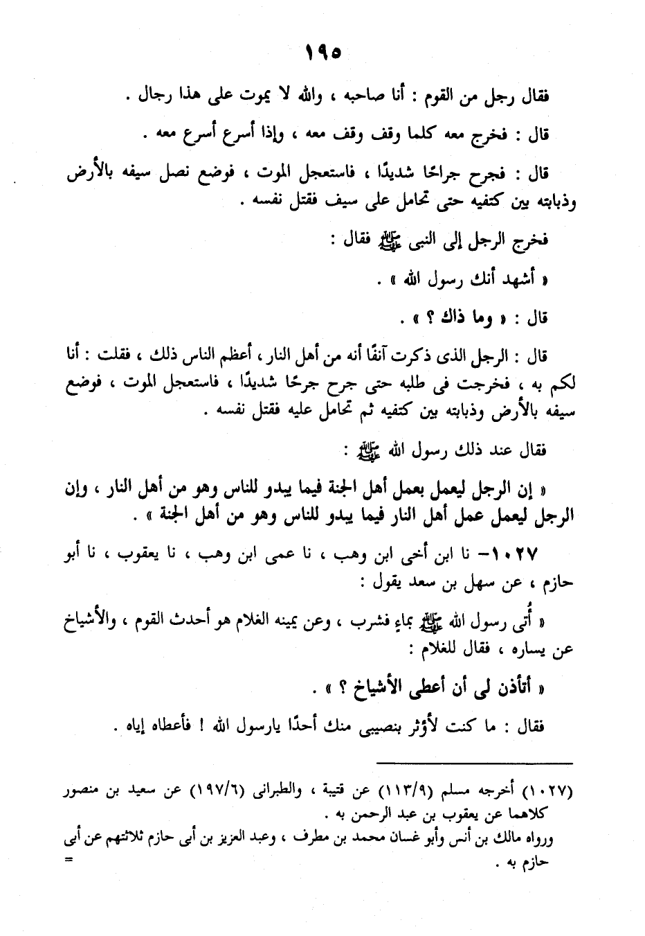 1027 - نَا ابْنُ أَخِي ابْنِ وَهْبٍ، نَا عَمِّي ابْنُ وَهْبٍ، نَا يَعْقُوبُ، نَا أَبُو حَازِمٍ , عَنْ سَهْلِ بْنِ سَعْدٍ يَقُولُ: أُتِيَ رَسُولُ اللَّهِ صَلَّى اللهُ عَلَيْهِ وَسَلَّمَ بِمَاءٍ فَشَرِبَ وَعَنْ يَمِينِهِ الْغُلَامُ هُوَ أَحْدَثُ الْقَوْمِ، وَالْأَشْيَاخُ عَنْ يَسَارِهِ، فَقَالَ لِلْغُلَامِ: «§أَتَأْذَنُ لِي أَنْ أُعْطِيَ الْأَشْيَاخَ؟» ، فَقَالَ: مَا كُنْتُ لِأُوثِرَ بِنَصِيبِي مِنْكَ أَحَدًا يَا رَسُولَ اللَّهِ، فَأَعْطَاهُ إِيَّاهُ