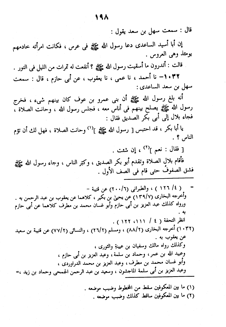 1032 - نَا أَحْمَدُ، نَا عَمِّي نَا يَعْقُوبُ، عَنْ أَبِي حَازِمٍ قَالَ: سَمِعْتُ سَهْلَ بْنَ سَعْدٍ السَّاعِدِيَّ: أَنَّهُ بَلَغَ رَسُولَ اللَّهِ صَلَّى اللهُ عَلَيْهِ وَسَلَّمَ أَنَّ بَنِي عَمْرِو بْنِ عَوْفٍ كَانَ بَيْنَهُمْ شَيْءٌ، فَخَرَجَ رَسُولُ اللَّهِ صَلَّى اللهُ عَلَيْهِ وَسَلَّمَ يُصْلِحُ بَيْنَهُمْ فِي أُنَاسٍ مَعَهُ، فَجَلَسَ رَسُولُ اللَّهِ وَحَانَتِ الصَّلَاةُ، فَجَاءَ بِلَالٌ إِلَى أَبِي بَكْرٍ الصِّدِّيقِ فَقَالَ: يَا أَبَا بَكْرٍ قَدِ احْتَبَسَ رَسُولُ اللَّهِ صَلَّى اللهُ عَلَيْهِ وَسَلَّمَ وَحَانَتِ الصَّلَاةُ، فَهَلْ لَكَ أَنْ تَؤُمَّ النَّاسَ؟، فَقَالَ: نَعَمْ، إِنْ شِئْتَ، فَأَقَامَ بِلَالٌ الصَّلَاةَ وَتَقَدَّمَ أَبُو بَكْرٍ الصِّدِّيقُ وَكَبَّرَ النَّاسُ، وَجَاءَ رَسُولُ اللَّهِ صَلَّى اللهُ عَلَيْهِ وَسَلَّمَ فَشَقَّ الصُّفُوفَ حَتَّى قَامَ فِي الصَّفِّ الْأَوَّلِ -[199]-، فَأَخَذَ النَّاسُ فِي التَّصْفِيقِ، فَكَانَ أَبُو بَكْرٍ لَا يَلْتَفِتُ فِي صَلَاتِهِ، فَلَمَّا أَكْثَرَ النَّاسُ التَّصْفِيقَ الْتَفَتَ فَإِذَا رَسُولُ اللَّهِ صَلَّى اللهُ عَلَيْهِ وَسَلَّمَ، فَأَشَارَ رَسُولُ اللَّهِ يَأْمُرُهُ أَنْ يُصَلِّيَ، فَرَفَعَ أَبُو بَكْرٍ يَدَهُ فَحَمِدَ اللَّهَ وَرَجَعَ الْقَهْقَرَى وَرَاءَهُ حَتَّى قَامَ فِي الصَّفِّ، فَتَقَدَّمَ رَسُولُ اللَّهِ صَلَّى اللهُ عَلَيْهِ وَسَلَّمَ فَصَلَّى بِالنَّاسِ، فَلَمَّا فَرَغَ أَقْبَلَ عَلَى النَّاسِ فَقَالَ: " أَيُّهَا النَّاسُ، مَا لَكُمْ إِذَا نَابَكُمْ فِي الصَّلَاةِ شَيْءٌ أَخَذْتُمْ بِالتَّصْفِيحِ؟ إِنَّمَا التَّصْفِيحُ لِلنِّسَاءِ، §مَنْ نَابَهُ شَيْءٌ فَلْيَقُلْ سُبْحَانَ اللَّهِ، فَإِنَّهُ لَا يَسْمَعُهُ أَحَدٌ يَقُولُ: سُبْحَانَ اللَّهِ، إِلَّا الْتَفَتَ، يَا أَبَا بَكْرٍ، مَا مَنَعَكَ أَنْ تُصَلِّيَ بِالنَّاسِ حِينَ أَشَرْتُ إِلَيْكَ؟ "، فَقَالَ أَبُو بَكْرٍ: مَا كَانَ يَنْبَغِي لِابْنِ أَبِي قُحَافَةَ أَنْ يُصَلِّيَ بَيْنَ يَدَيْ رَسُولِ اللَّهِ صَلَّى اللهُ عَلَيْهِ وَسَلَّمَ