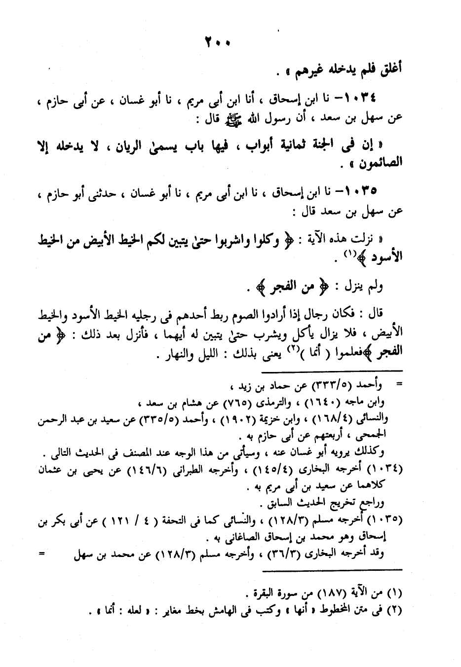1035 - نَا ابْنُ إِسْحَاقَ , نَا ابْنُ أَبِي مَرْيَمَ، نَا أَبُو غَسَّانَ , حَدَّثَنِي أَبُو حَازِمٍ , عَنْ سَهْلِ بْنِ سَعْدٍ قَالَ: نَزَلَتْ هَذِهِ الْآيَةُ {§وَكُلُوا وَاشْرَبُوا حَتَّى يَتَبَيَّنَ لَكُمُ الْخَيْطُ الْأَبْيَضُ مِنَ الْخَيْطِ الْأَسْوَدِ} [البقرة: 187] وَلَمْ يَنْزِلْ: {مِنَ الْفَجْرِ} [البقرة: 187] ، قَالَ: فَكَانَ رِجَالٌ إِذَا أَرَادُوا الصَّوْمَ رَبَطَ أَحَدُهُمْ فِي رِجْلَيْهِ الْخَيْطَ الْأَسْوَدَ وَالْخَيْطَ الْأَبْيَضَ، فَلَا يَزَالُ يَأْكُلُ وَيَشْرَبُ حَتَّى يَتَبَيَّنَ لَهُ أَيُّهُمَا، فَأُنْزِلَ بَعْدَ ذَلِكَ: {مِنَ الْفَجْرِ} [البقرة: 187] ، فَعَلِمُوا أَنَّمَا يَعْنِي بِذَلِكَ: اللَّيْلَ وَالنَّهَارَ
