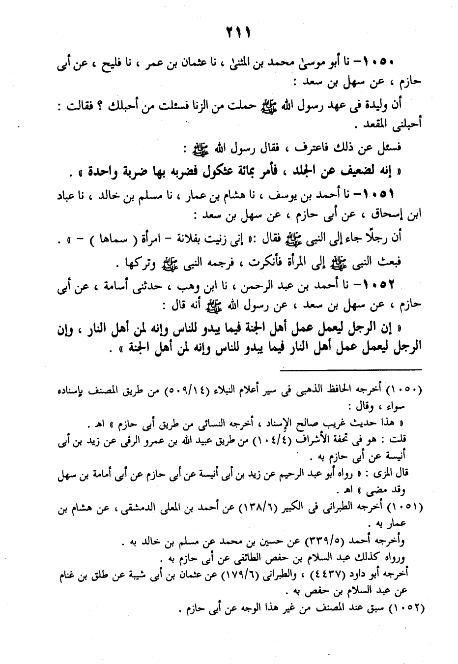 1050 - نَا أَبُو مُوسَى مُحَمَّدُ بْنُ الْمُثَنَّى، نَا عُثْمَانُ بْنُ عُمَرَ، نَا فُلَيْحٌ، عَنْ أَبِي حَازِمٍ , عَنْ سَهْلِ بْنِ سَعْدٍ، أَنَّ وَلِيدَةً فِي عَهْدِ رَسُولِ اللَّهِ صَلَّى اللهُ عَلَيْهِ وَسَلَّمَ حَمَلَتْ مِنَ الزِّنَا، فَسُئِلَتْ مَنْ أَحْبَلَكِ؟ فَقَالَتْ: أَحْبَلَنِي الْمُقْعَدُ، فَسُئِلَ عَنْ ذَلِكَ فَاعْتَرَفَ، فَقَالَ رَسُولُ اللَّهِ صَلَّى اللهُ عَلَيْهِ وَسَلَّمَ: «§إِنَّهُ لَضَعِيفٌ عَنِ الْجَلْدِ» ، فَأَمَرَ بِمِائَةِ عُثْكُولٍ فَضَرَبَهُ بِهَا ضَرْبَةً وَاحِدَةً