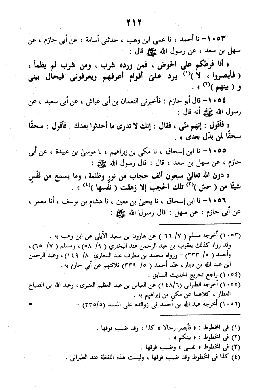 1053 - نَا أَحْمَدُ، نَا عَمِّي ابْنُ وَهْبٍ، حَدَّثَنِي أُسَامَةُ، عَنْ أَبِي حَازِمٍ , عَنْ سَهْلِ بْنِ سَعْدٍ، عَنْ رَسُولِ اللَّهِ صَلَّى اللهُ عَلَيْهِ وَسَلَّمَ قَالَ: «§أَنَا فَرَطُكُمْ عَلَى الْحَوْضِ، فَمَنْ وَرَدَهُ شَرِبَ، وَمَنْ شَرِبَ لَمْ يَظْمَأْ، فَأَبْصِرُوا لَا يَرِدُ عَلَيَّ أَقْوَامٌ أَعْرِفُهُمْ وَيَعْرِفُونِي فَيُحَالُ بَيْنِي وَبَيْنَهُمْ»