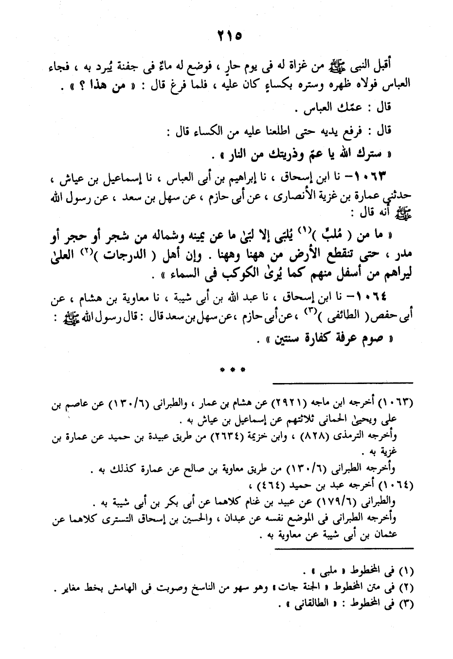 نَا ابْنُ إِسْحَاقَ , نَا عَبْدُ اللَّهِ بْنُ أَبِي شَيْبَةَ , نَا مُعَاوِيَةُ بْنُ هِشَامٍ، عَنْ أَبِي حَفْصٍ الطَّائِفِيِّ , عَنْ أَبِي حَازِمٍ , عَنْ سَهْلِ بْنِ سَعْدٍ قَالَ: قَالَ رَسُولُ اللَّهِ صَلَّى اللهُ عَلَيْهِ وَسَلَّمَ: «§صَوْمُ عَرَفَةَ كَفَّارَةُ سَنَتَيْنِ»