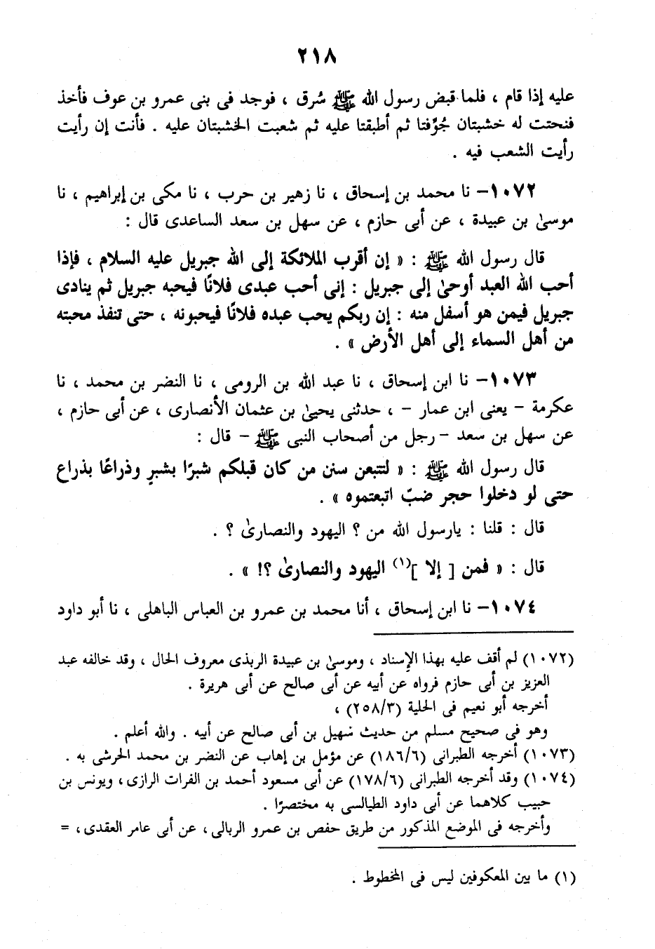 نَا ابْنُ إِسْحَاقَ , نَا عَبْدُ اللَّهِ بْنُ الرُّومِيِّ , نَا النَّضْرُ بْنُ مُحَمَّدٍ , نَا عِكْرِمَةُ يَعْنِي ابْنَ عَمَّارٍ، حَدَّثَنِي يَحْيَى بْنُ عُثْمَانَ الْأَنْصَارِيُّ، عَنْ أَبِي حَازِمٍ , عَنْ سَهْلِ بْنِ سَعْدٍ رَجُلٍ مِنْ أَصْحَابِ النَّبِيِّ صَلَّى اللهُ عَلَيْهِ وَسَلَّمَ قَالَ: قَالَ رَسُولُ اللَّهِ صَلَّى اللهُ عَلَيْهِ وَسَلَّمَ: «§لَتَتَّبِعُنَّ سَنَنَ مَنْ كَانَ قَبْلَكُمْ شِبْرًا بِشِبْرٍ وَذِرَاعًا بِذِرَاعٍ، حَتَّى لَوْ دَخَلُوا جُحْرَ ضَبٍّ اتَّبَعْتُمُوهُ» . قَالَ: قُلْنَا: يَا رَسُولَ اللَّهِ، مِنَ الْيَهُودِ وَالنَّصَارَى؟، قَالَ: «فَمَنْ إِلَّا الْيَهُودُ وَالنَّصَارَى»