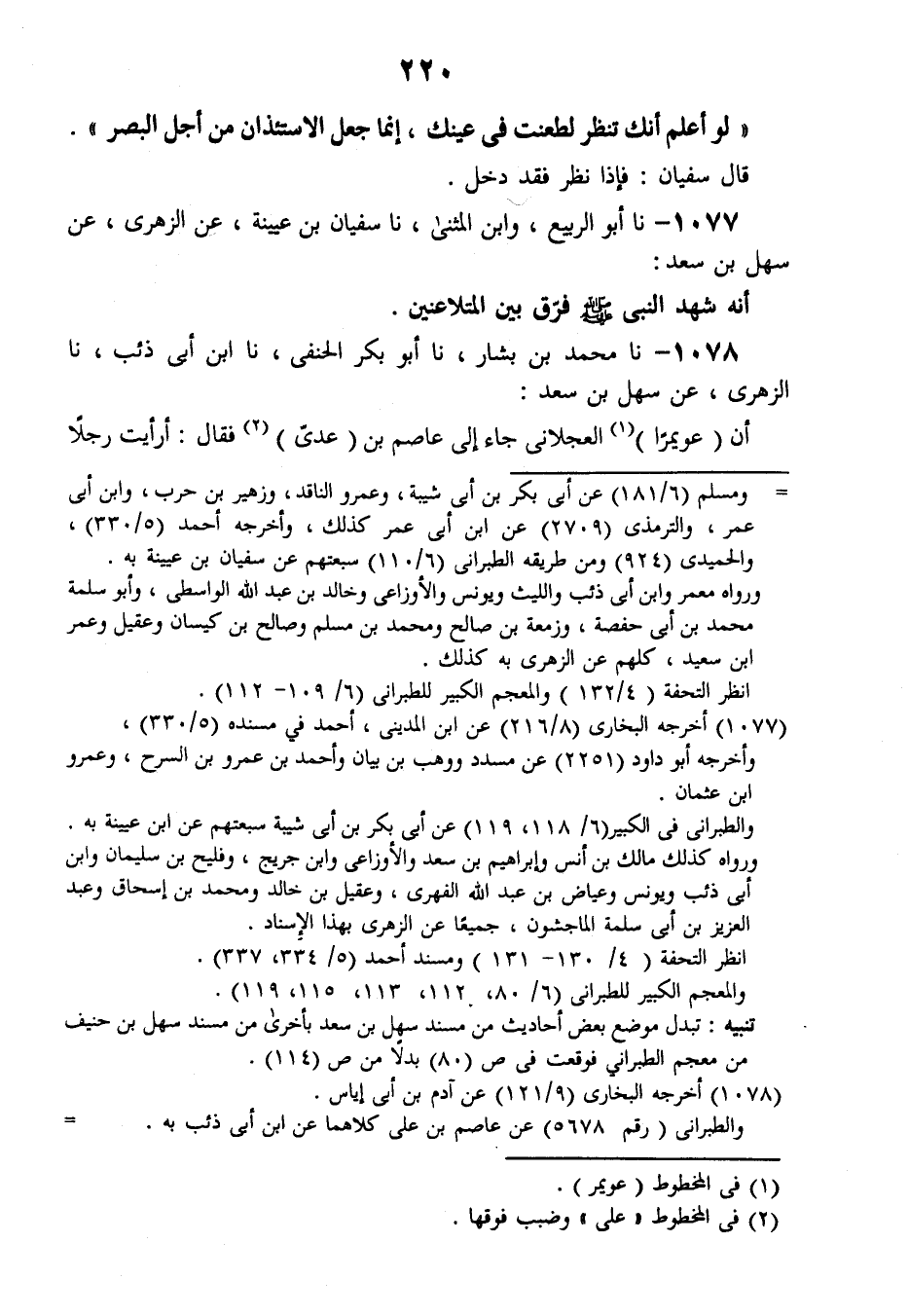 1078 - نَا مُحَمَّدُ بْنُ بَشَّارٍ، نَا أَبُو بَكْرٍ الْحَنَفِيُّ , نَا ابْنُ أَبِي ذِئْبٍ , نَا الزُّهْرِيُّ , عَنْ سَهْلِ بْنِ سَعْدٍ، أَنَّ عُوَيْمِرًا الْعَجْلَانِيَّ جَاءَ إِلَى عَاصِمِ بْنِ عَدِيٍّ فَقَالَ: أَرَأَيْتَ رَجُلًا -[221]- وَجَدَ مَعَ أَهْلِهِ رَجُلًا فَقَتَلَهُ أَتَقْتُلُونَهُ؟ سَلْ لِي رَسُولَ اللَّهِ صَلَّى اللهُ عَلَيْهِ وَسَلَّمَ، فَجَاءَ عَاصِمٌ فَسَأَلَ رَسُولَ اللَّهِ صَلَّى اللهُ عَلَيْهِ وَسَلَّمَ، فَقَالَ: «إِنَّهُ قَدْ §نَزَلَ فِيكُمُا الْقُرْآنُ» ، فَتَقَدَّمَا فَتَلَاعَنَا، ثُمَّ قَالَ: كَذَبْتُ عَلَيْهَا يَا رَسُولَ اللَّهِ إِنْ أَمْسَكْتُهَا، فَفَارَقَهَا وَمَا أَمَرَهُ رَسُولُ اللَّهِ صَلَّى اللهُ عَلَيْهِ وَسَلَّمَ بِفِرَاقِهَا، فَثَبَتَتِ السُّنَّةُ فِي الْمُتَلَاعِنَيْنِ، فَقَالَ رَسُولُ اللَّهِ صَلَّى اللهُ عَلَيْهِ وَسَلَّمَ: «انْظُرُوهَا، فَإِنْ جَاءَتْ بِهِ أَحْمَرَ قَصِيرًا كَأَنَّهُ وَحَرَةٌ فَلَا أَحْسَبُ إلَّا كَذَبَ عَلَيْهَا، وَإِنْ جَاءَتْ بِهِ أَسْحَمَ أَعْيَنَ ذَا أَلْيَتَيْنِ فَلَا أَحْسَبُ إِلَّا صَدَقَ عَلَيْهَا» فَجَاءَتْ بِهِ عَلَى الْمَكْرُوهِ