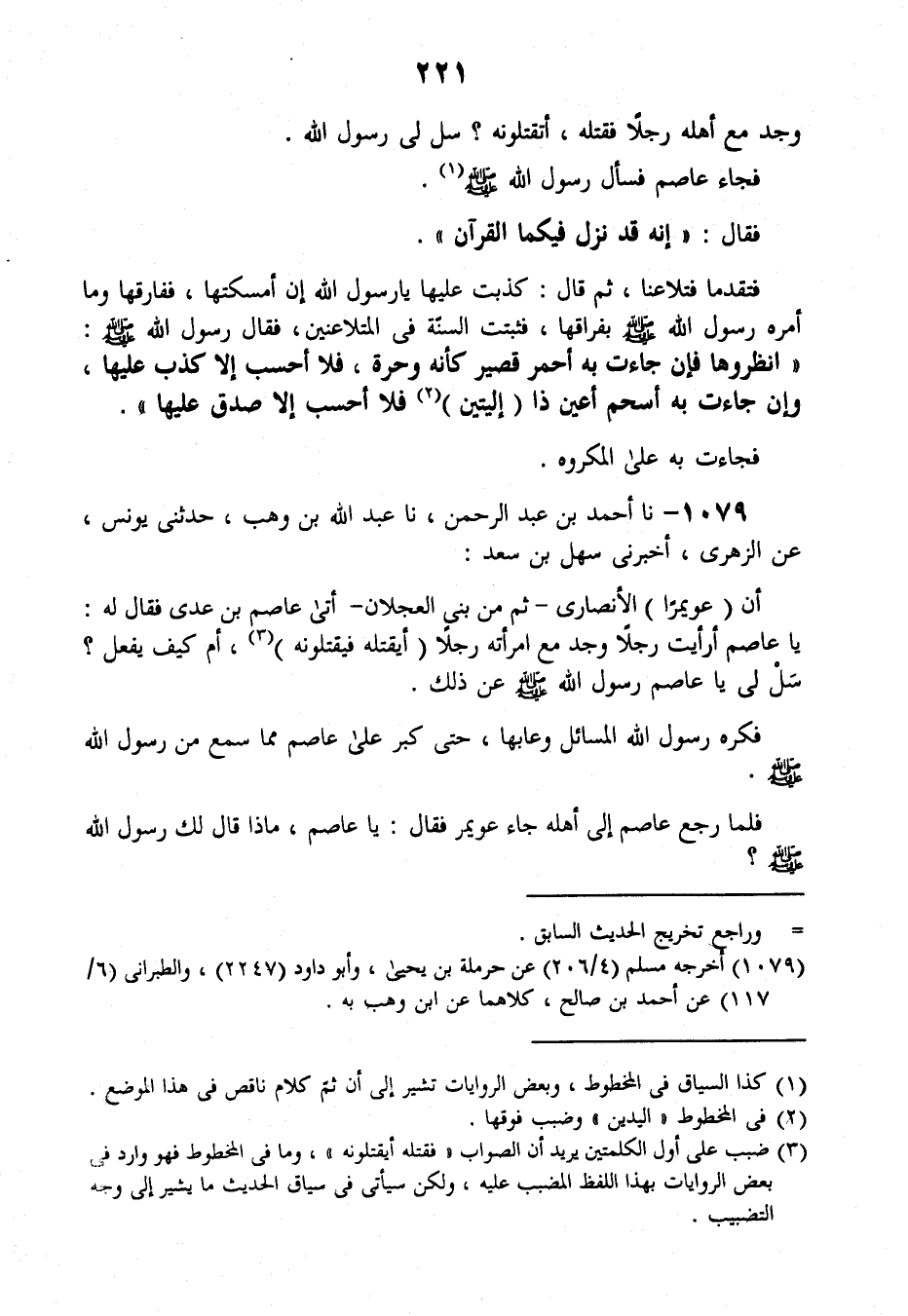 1079 - نَا أَحْمَدُ بْنُ عَبْدِ الرَّحْمَنِ، نَا عَبْدُ اللَّهِ بْنُ وَهْبٍ , حَدَّثَنِي يُونُسُ عَنِ الزُّهْرِيِّ أَخْبَرَنِي سَهْلُ بْنُ سَعْدٍ، أَنَّ عُوَيْمِرًا الْأَنْصَارِيَّ، ثُمَّ مِنْ بَنِي الْعَجْلَانِ، أَتَى عَاصِمَ بْنَ عَدِيٍّ فَقَالَ لَهُ: يَا عَاصِمُ، أَرَأَيْتَ رَجُلًا وَجَدَ مَعَ امْرَأَتَهِ رَجُلًا أَيَقْتُلُهُ فَيَقْتُلُونَهَ أَمْ كَيْفَ يَفْعَلُ؟ سَلْ لِي يَا عَاصِمُ رَسُولَ اللَّهِ صَلَّى عَلَيْهِ وَسَلَّمَ عَنْ ذَلِكَ. فَكَرِهَ رَسُولُ اللَّهِ الْمَسَائِلَ وَعَابَهَا حَتَّى كَبُرَ عَلَى عَاصِمٍ مِمَّا سَمِعَ مِنْ رَسُولِ اللَّهِ صَلَّى اللهُ عَلَيْهِ وَسَلَّمَ، فَلَمَّا رَجَعَ عَاصِمٌ إِلَى أَهْلِهِ جَاءَ عُوَيْمِرٌ فَقَالَ: يَا عَاصِمُ، مَاذَا قَالَ لَكَ رَسُولُ اللَّهِ صَلَّى اللهُ عَلَيْهِ وَسَلَّمَ؟ -[222]-. قَالَ عَاصِمٌ لِعُوَيْمِرٍ: لَمْ تَأْتِنِي بِخَيْرٍ، قَدْ كَرِهَ رَسُولُ اللَّهِ الَّتِي سَأَلْتُهُ عَنْهَا وَعَابَهَا. قَالَ عُوَيْمِرٌ: وَاللَّهِ مَا أَنْتَهِي حَتَّى أَسْأَلَهُ، فَأَتَى عُوَيْمِرٌ حَتَّى سَأَلَ رَسُولَ اللَّهِ وَسَطَ النَّاسِ فَقَالَ: يَا رَسُولَ اللَّهِ، أَرَأَيْتَ رَجُلًا وَجَدَ مَعَ امْرَأَتِهِ رَجُلًا فَقَتَلَهُ أَيَقْتُلُونَهُ أَمْ كَيْفَ يَفْعَلُ؟ . قَالَ رَسُولُ اللَّهِ صَلَّى اللهُ عَلَيْهِ وَسَلَّمَ: «قَدْ §أُنْزِلَ فِيكَ وَفِي صَاحِبَتِكَ، فَاذْهَبْ فَائْتِ بِهَا» . وَنَزَلَ الْقُرْآنُ؛ قَالَ سَهْلٌ فَتَلَاعَنَا وَأَنَا مَعَ النَّاسِ عِنْدَ رَسُولِ اللَّهِ، فَلَمَّا فَرَغَا مِنْ تَلَاعُنِهِمَا قَالَ: يَا رَسُولَ اللَّهِ، كَذَبْتُ عَلَيْهَا إِنْ أَنَا أَمْسَكْتُهَا، فَطَلَّقَهَا ثَلَاثًا قَبْلَ أَنْ يَأْمُرَهُ رَسُولُ اللَّهِ، وَكَانَ فِرَاقَهُ إِيَّاهَا يُعَدُّ سَنَةً فِي الْمُتَلَاعِنِينَ. قَالَ سَهْلٌ: وَكَانَتْ حَامِلًا فَأَنْكَرَ الرَّجُلُ حَمْلَهَا، فَكَانَ ابْنُهُ يُدْعَى إِلَى أُمِّهِ، ثُمَّ جَرَتِ السُّنَّةُ أَنَّهُ يَرِثُهَا وَتَرِثُهُ مَا فَرَضَ اللَّهُ لَهَا قَالَ يُونُسُ: وَجَدْتُ فِي كُتُبِي مَعَ حَدِيثِ ابْنِ شِهَابٍ هَذَا الْحَدِيثَ الْآخَرَ، وَلَا أَدْرِي أَهُوَ حَدَّثَنِيهِ أَوْ غَيْرَهُ، غَيْرَ أَنِّي كَتَبْتُهُ بِيَدِي عَنْ ثِقَةٍ أَنَّهُمُ اجْتَمَعُوا عِنْدَ النَّبِيِّ صَلَّى اللهُ عَلَيْهِ وَسَلَّمَ جَمِيعًا وَكَانُوا بَنِي عَمِّ عُوَيْمِرٍ وَامْرَأَتَهُ وَابْنَ عَمِّهِ الَّذِي قِيلَ فِيهِ مَا قِيلَ، فَسَأَلَهُ النَّبِيُّ صَلَّى اللهُ عَلَيْهِ وَسَلَّمَ وَاحِدًا وَاحِدًا، فَكَذَّبَ بَعْضُهُمْ بَعْضًا وَحَلَفَ، فَقَالَ النَّبِيُّ صَلَّى اللهُ عَلَيْهِ وَسَلَّمَ: «وَيْلَكَ، مَاذَا تَقُولُ لِابْنِ عَمِّكَ؟» . قَالَ: أَحْلِفُ بِاللَّهِ إِنَّهُ لَكَاذِبٌ، وَلَقَدْ كُنْتُ أَدْخَلُ بَيْتَهُ بُيُوتَ عَمِّي لَيْلًا وَنَهَارًا، وَكُنْتُ أَمْرَءًا عَزَبًا فَأَصَبْتُ مِنَ الطَّعَامِ، وَمَا أَرَدْتُ رِيبَةً وَلَا فَاحِشَةً، فَأَمَرَ النَّبِيُّ صَلَّى اللهُ عَلَيْهِ وَسَلَّمَ الزَّوْجَ وَالْمَرْأَةَ فَحَلَفَا بَعْدَ الْعَصْرِ عِنْدَ الْمِنْبَرِ، وَكَانَ الَّذِي رَمَى بِهِ رَجُلًا شَدِيدًا الْأَدَمَةِ ابْنَ الْحَبَشِيَّةِ -[223]-، فَقَالَ النَّبِيُّ صَلَّى اللهُ عَلَيْهِ وَسَلَّمَ: «إِنْ وَلَدْتِ فَلَا تُرْضِعِيهِ حَتَّى تَأْتُونِي بِهِ» . فَوَلَدَتْ غُلَامًا أَسْودَ جَعْدَ الرَّأْسِ كَأَنَّهُ ابْنُ الْحَبَشِيَّةِ، قَالَ: «لَوْلَا الْأَيْمَانُ الَّتِي حَلَفْتِ لَكَانَ لِي فِي هَذَا أَمْرٌ»