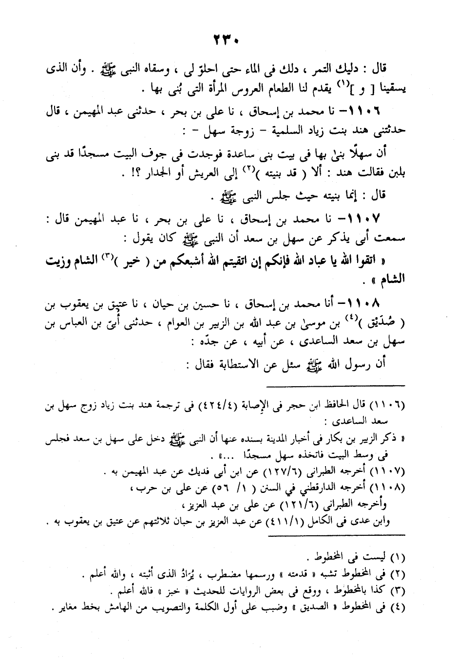 1106 - نَا مُحَمَّدُ بْنُ إِسْحَاقَ، نَا عَلِيُّ بْنُ بَحْرٍ، حَدَّثَنِي عَبْدُ الْمُهَيْمِنِ , قَالَ: حَدَّثَتْنِي هِنْدُ بِنْتُ زِيَادٍ السُّلَمِيَّةُ زَوْجَةُ سَهْلٍ: أَنَّ سَهْلًا بَنَى بِهَا فِي بَيْتِ بَنِي سَاعِدَةَ، فَوَجَدَتْ فِي جَوْفِ الْبَيْتِ مَسْجِدًا قَدْ بُنِيَ بِلَبِنٍ، فَقَالَتْ هِنْدُ: أَلَا قَدْ بَنَيْتَهُ إِلَى الْعَرِيشِ أَوِ الْجِدَارِ؟ قَالَ: «إِنَّمَا §بَنَيْتُهُ حَيْثُ جَلَسَ النَّبِيُّ صَلَّى اللهُ عَلَيْهِ وَسَلَّمَ»