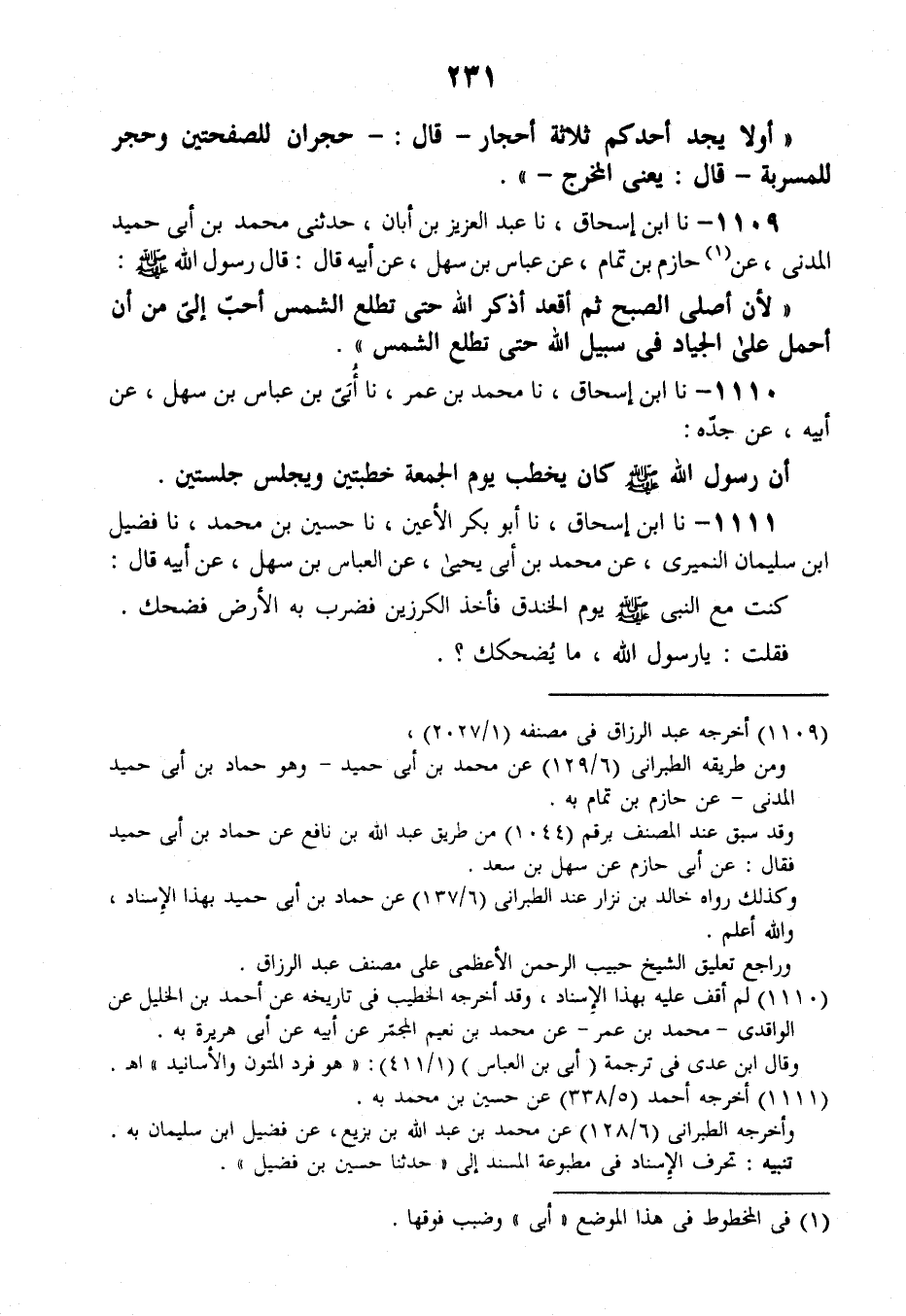 1109 - نَا ابْنُ إِسْحَاقَ , نَا عَبْدُ الْعَزِيزِ بْنُ أَبَانَ , حَدَّثَنِي مُحَمَّدُ بْنُ أَبِي حُمَيْدٍ الْمَدَنِيُّ، عَنْ حَازِمِ بْنِ تَمَامٍ، عَنْ عَبَّاسِ بْنِ سَهْلٍ، عَنْ أَبِيهِ، قَالَ: قَالَ رَسُولُ اللَّهِ صَلَّى اللهُ عَلَيْهِ وَسَلَّمَ: «§لَأَنْ أُصَلِّيَ الصُّبْحَ، ثُمَّ أَقْعُدَ أَذْكُرُ اللَّهَ حَتَّى تَطْلُعَ الشَّمْسُ أَحَبُّ إِلَيَّ مِنْ أَنْ أَحْمِلَ عَلَى الْجِيَادِ فِي سَبِيلِ اللَّهِ حَتَّى تَطْلُعَ الشَّمْسُ»