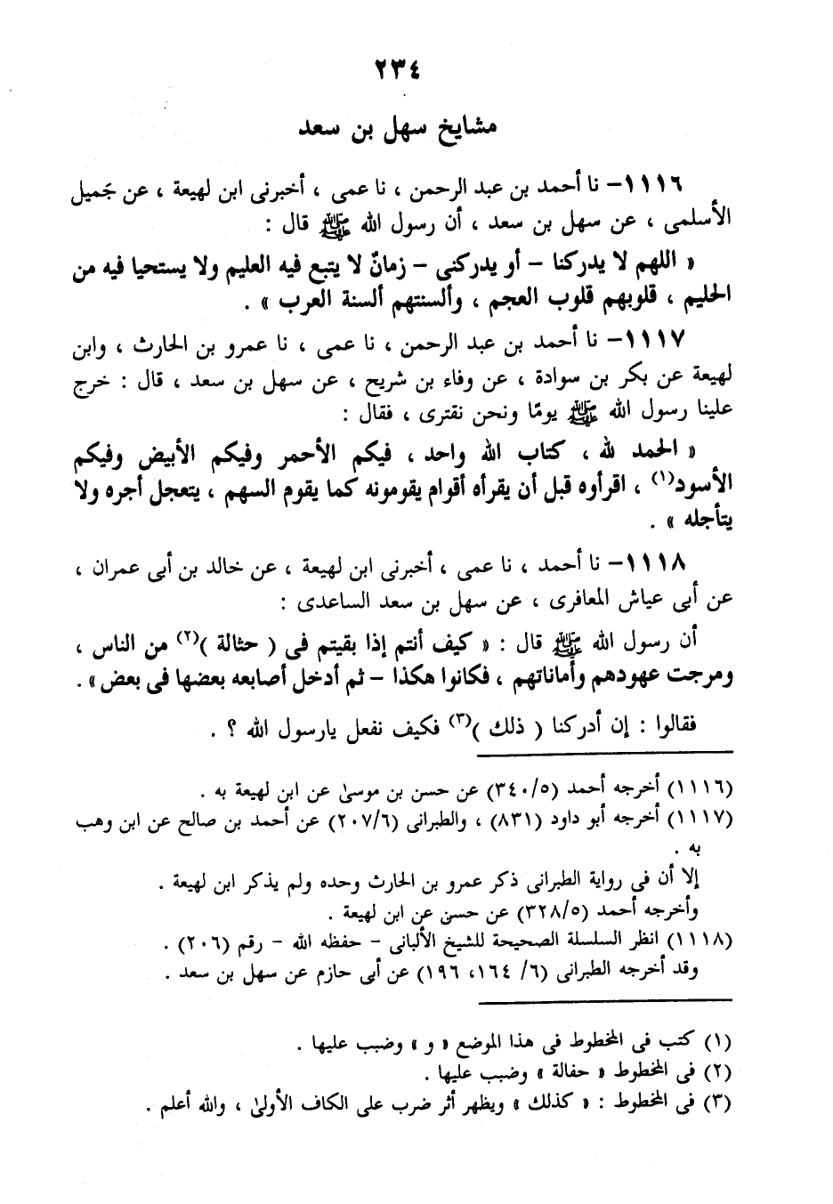 1116 - نَا أَحْمَدُ بْنُ عَبْدِ الرَّحْمَنِ، نَا عَمِّي، أَخْبَرَنِي ابْنُ لَهِيعَةَ , عَنْ جَمِيلٍ الْأَسْلَمِيِّ، عَنْ سَهْلِ بْنِ سَعْدٍ، أَنَّ رَسُولَ اللَّهِ صَلَّى اللهُ عَلَيْهِ وَسَلَّمَ قَالَ: «§اللَّهُمَّ لَا يُدْرِكْنَا أَوْ يُدْرِكْنِي زَمَانٌ لَا يُتْبَعُ فِيهِ الْعَلِيمُ، وَلَا يُسْتَحْيَا فِيهِ مِنَ الْحَلِيمِ، قُلُوبُهُمْ قُلُوبُ الْعَجَمِ وَأَلْسِنَتُهُمْ أَلْسِنَةُ الْعَرَبِ»