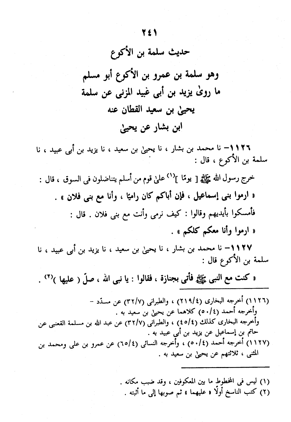 نَا مُحَمَّدُ بْنُ بَشَّارٍ، نَا يَحْيَى بْنُ سَعِيدٍ، نَا يَزِيدُ بْنُ أَبِي عُبَيْدٍ، نَا سَلَمَةُ بْنُ الْأَكْوَعِ قَالَ: خَرَجَ رَسُولُ اللَّهِ صَلَّى اللهُ عَلَيْهِ وَسَلَّمَ يَوْمًا عَلَى قَوْمٍ مِنْ أَسْلَمَ يَتَنَاضَلُونَ فِي السُّوقِ قَالَ: «§ارْمُوا بَنِي إِسْمَاعِيلَ فَإِنَّ أَبَاكُمْ كَانَ رَامِيًا، وَأَنَا مَعَ بَنِي فُلَانٍ» ، فأَمْسَكُوا بِأَيْدِيهِمْ وقَالُوا: كَيْفَ نَرْمِي وَأَنْتَ مَعَ بَنِي فُلَانٍ؟ قَالَ: «ارْمُوا وَأَنَا مَعَكُمْ كُلِّكُمْ»