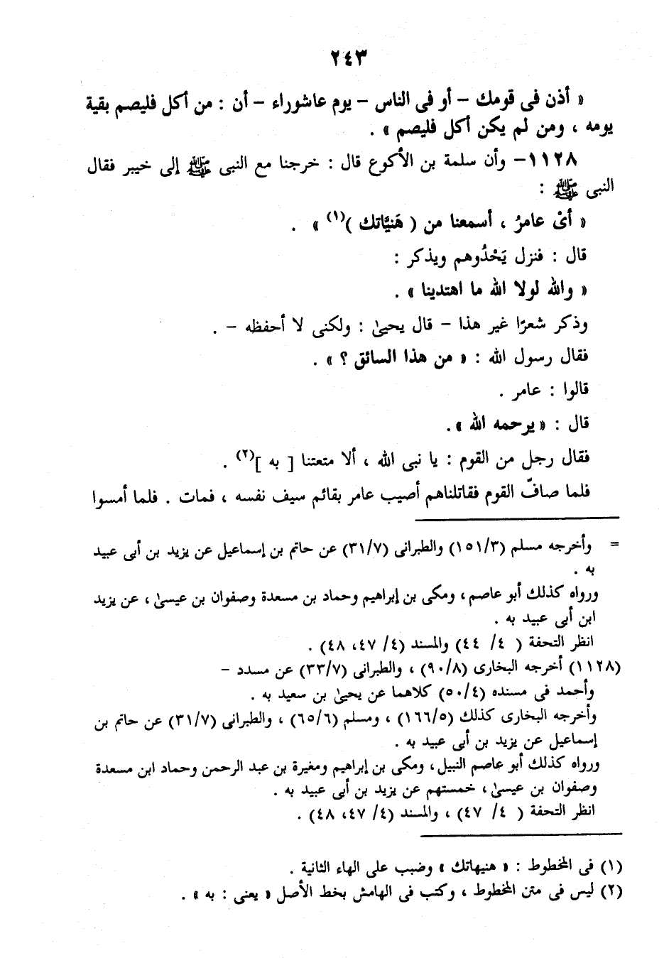 1128 - وَأَنَّ سَلَمَةَ بْنَ الْأَكْوَعِ قَالَ: خَرَجْنَا مَعَ النَّبِيِّ صَلَّى اللهُ عَلَيْهِ وَسَلَّمَ إِلَى خَيْبَرَ، فَقَالَ النَّبِيُّ صَلَّى اللهُ عَلَيْهِ وَسَلَّمَ: «أَيْ عَامِرُ، §أَسْمِعْنَا مِنْ هُنَيَّاتِكَ» ، قَالَ: فَنَزَلَ يَحْدُوهُمْ وَيَذْكُرُ: وَاللَّهِ لَوْلَا اللَّهُ مَا اهْتَدَيْنَا وَذَكَرَ شِعْرًا غَيْرَ هَذَا قَالَ يَحْيَى: وَلَكِنِّي لَا أَحْفَظُهُ، فَقَالَ رَسُولُ اللَّهِ: «مَنْ هَذَا السَّائِقُ؟» ، قَالُوا: عَامِرٌ، قَالَ: «يَرْحَمُهُ اللَّهُ؟» ، فَقَالَ رَجُلٌ مِنَ الْقَوْمِ: يَا نَبِيَّ اللَّهِ، أَلَا مَتَّعْتَنَا بِهِ، فَلَمَّا صَافَّ الْقَوْمُ فَقَاتَلْنَاهُمْ أُصِيبَ عَامِرٌ بِقَائِمِ سَيْفِ نَفْسِهِ فَمَاتَ، فَلَمَّا أَمْسَوْا -[244]- أَوْقَدُوا نَارًا كَثِيرَةً، فَقَالَ رَسُولُ اللَّهِ: «مَا هَذِهِ النَّارُ؟ عَلَى أَيِّ شَيْءٍ تُوقَدُ هَذِهِ النَّارُ؟» ، قَالُوا: عَلَى حُمُرٍ إِنْسِيَّةٍ، قَالَ: «أَهْرِيقُوا مَا فِيهَا وَكَسِّرُوهَا» . فَقَالَ رَجُلٌ: أَوَ لَا نُهَرِيقُهَا وَنَغْسِلُهَا؟، قَالَ: «بَلَى»