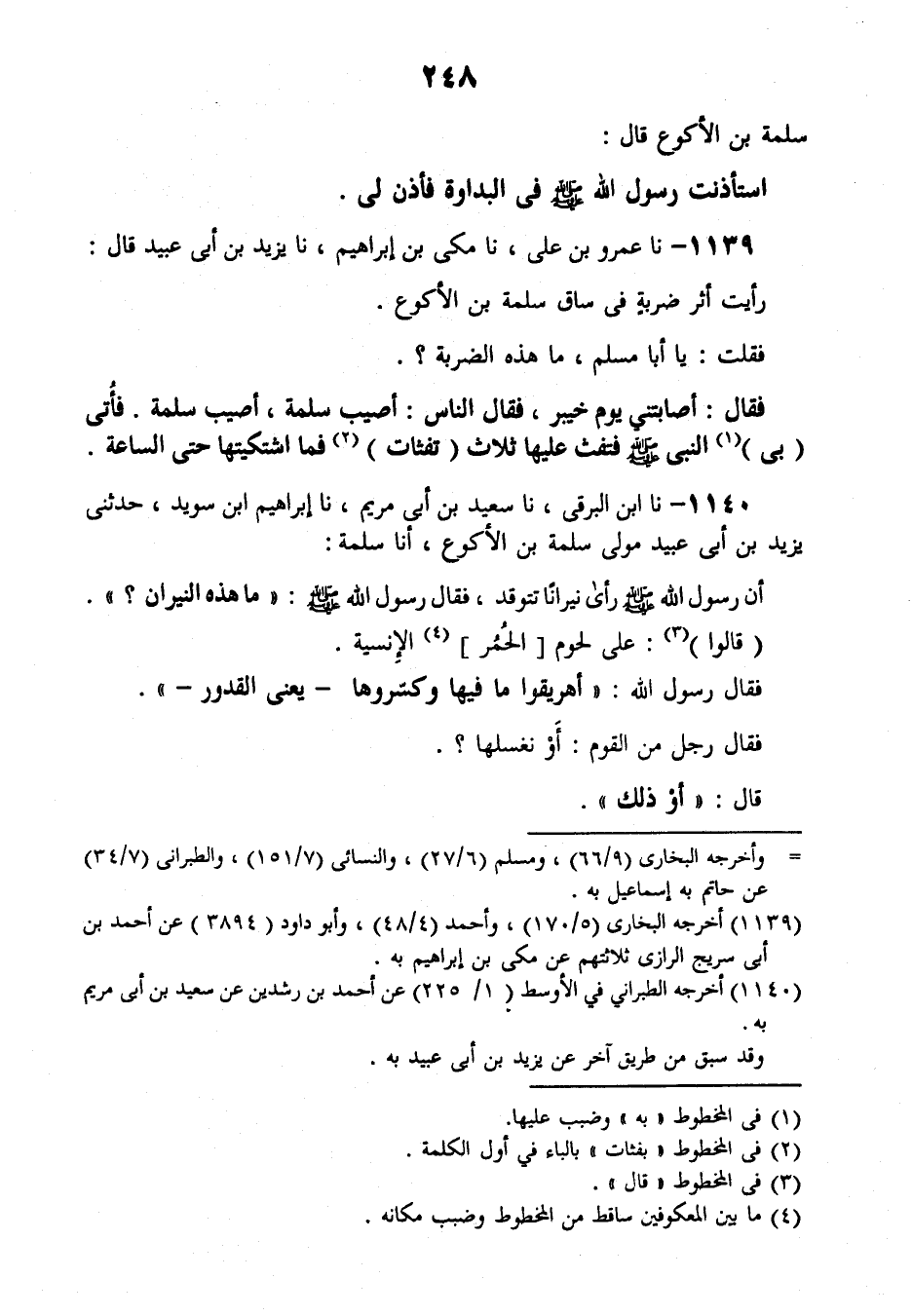 1139 - نَا عَمْرُو بْنُ عَلِيٍّ، نَا مَكِّيُّ بْنُ إِبْرَاهِيمَ، نَا يَزِيدُ بْنُ أَبِي عُبَيْدٍ قَالَ: رَأَيْتُ أَثَرَ ضَرْبَةٍ فِي سَاقِ سَلَمَةَ بْنِ الْأَكْوَعِ فَقُلْتُ: يَا أَبَا مُسْلِمٍ، مَا هَذِهِ الضَّرْبَةُ؟، فَقَالَ: أَصَابَتْنِي يَوْمَ خَيْبَرٍ، فَقَالَ النَّاسُ: أُصِيبَ سَلَمَةُ، أُصِيبَ سَلَمَةُ. فَأُتِيَ بِي النَّبِيُّ صَلَّى اللهُ عَلَيْهِ وَسَلَّمَ، §فَنَفَثَ عَلَيْهَا ثَلَاثَ نَفْثَاتٍ فَمَا اشْتَكَيْتُهَا حَتَّى السَّاعَةِ