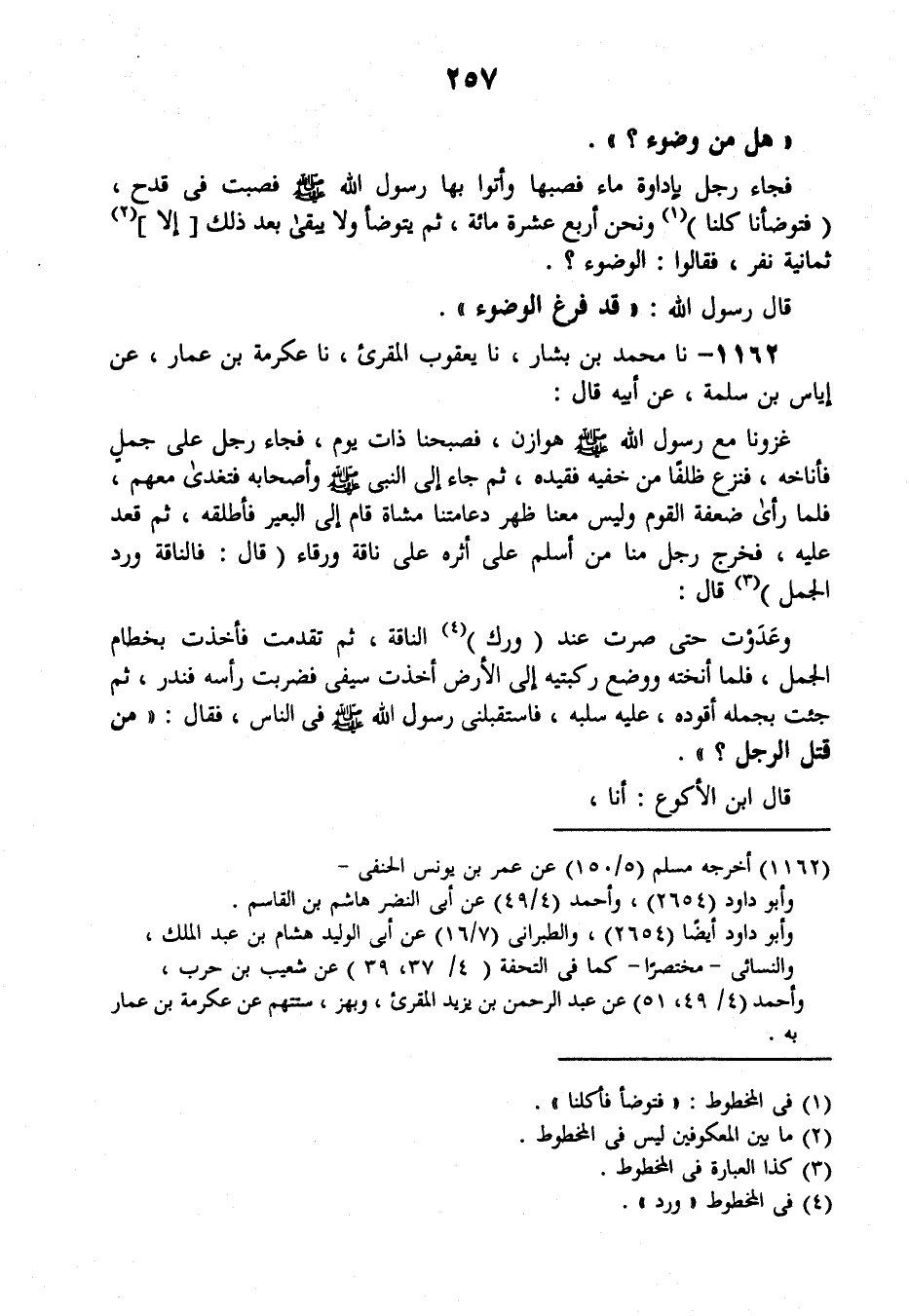 1162 - نَا مُحَمَّدُ بْنُ بَشَّارٍ، نَا يَعْقُوبُ الْمُقْرِئُ، نَا عِكْرِمَةُ بْنُ عَمَّارٍ، عَنْ إِيَاسِ بْنِ سَلَمَةَ، عَنْ أَبِيهِ، قَالَ: غَزَوْنَا مَعَ رَسُولِ اللَّهِ صَلَّى اللهُ عَلَيْهِ وَسَلَّمَ هَوَازِنَ فَصَبَّحْنَا ذَاتَ يَوْمٍ، فَجَاءَ رَجُلٌ عَلَى جَمَلٍ فَأَنَاخَهُ فَنَزَعَ ظِلْفًا مِنْ خُفَّيْهِ فَقَيَّدَهُ ثُمَّ جَاءَ إِلَى النَّبِيِّ صَلَّى اللهُ عَلَيْهِ وَسَلَّمَ، وَأَصْحَابِهِ فَتَغَدَّى مَعَهُمْ، فَلَمَّا رَأَى ضَعَفَةَ الْقَوْمِ وَلَيْسَ مَعَنَا ظَهْرٌ وَعَامَّتُنَا مُشَاةٌ، قَامَ إِلَى الْبَعِيرِ فَأَطْلَقَهُ، ثُمَّ قَعَدَ عَلَيْهِ فَخَرَجَ رَجُلٌ مِنَّا مِنْ أَسْلَمَ عَلَى أَثَرِهِ عَلَى نَاقَةٍ وَرْقَاءَ قَالَ: فَالنَّاقَةُ، وَرَدَّ الْجَمَلَ، قَالَ: وَعَدَوْتُ حَتَّى صِرْتُ عِنْدَ وَرِكِ النَّاقَةِ، ثُمَّ تَقَدَّمْتُ فَأَخَذْتُ بِخِطَامِ الْجَمَلِ، فَلَمَّا أَنَخْتُهُ وَوَضَعَ رُكْبَتَيْهِ إِلَى الْأَرْضِ أَخَذْتُ سَيْفِي فَضَرَبْتُ رَأْسَهُ فَنَدَرَ، ثُمَّ جِئْتُ بِجَمَلِهِ أَقُودُهُ عَلَيْهِ سَلَبُهُ، فَاسْتَقْبَلَنِي رَسُولُ اللَّهِ صَلَّى اللهُ عَلَيْهِ وَسَلَّمَ فِي النَّاسِ فَقَالَ: «مَنْ قَتَلَ الرَّجُلَ؟» ، قَالَ ابْنُ الْأَكْوَعِ: أَنَا -[258]-. قَالَ رَسُولُ اللَّهِ: «§لَكَ سَلَبُهُ أَجْمَعُ»