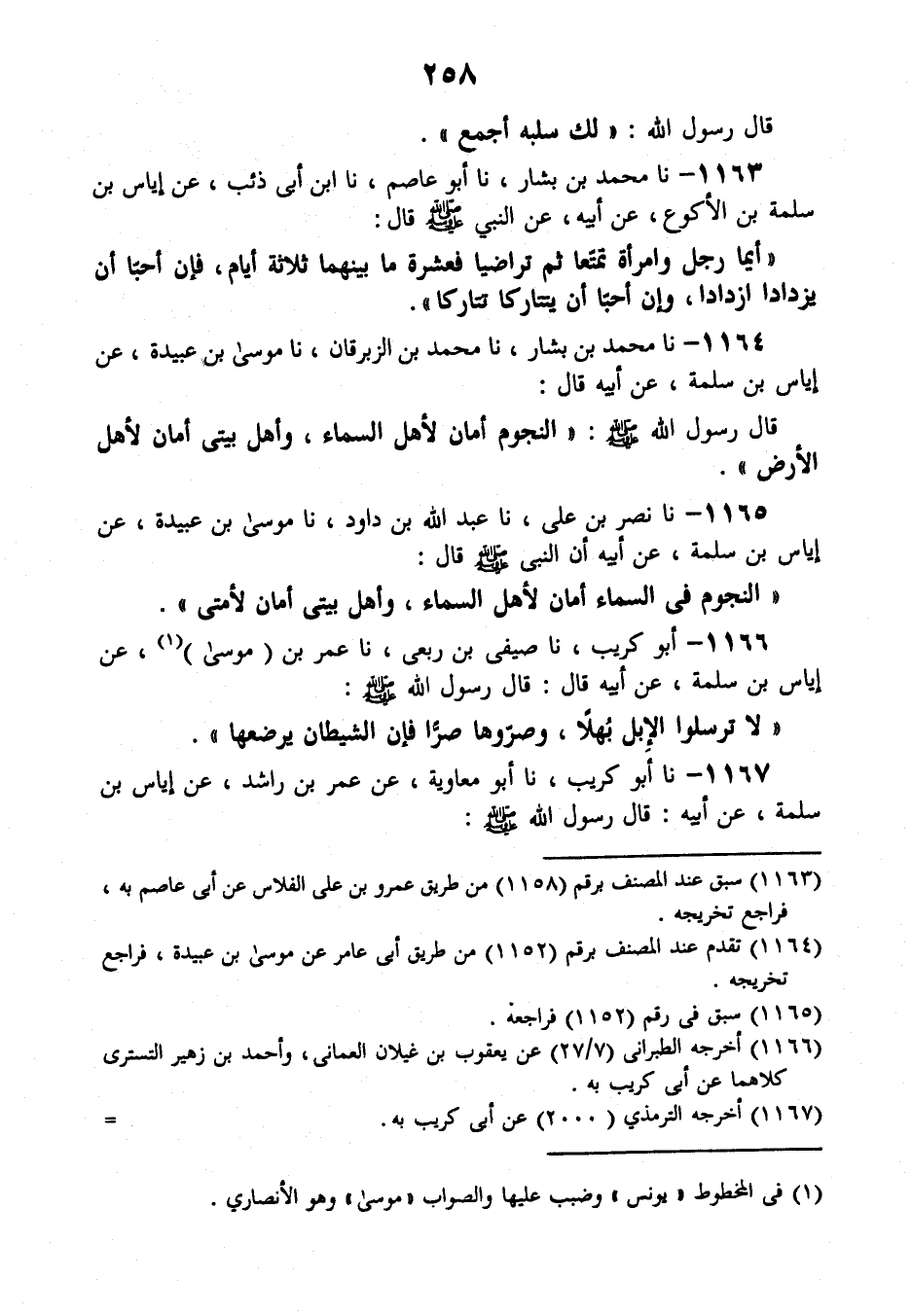 1166 - أَبُو كُرَيْبٍ، نَا صَيْفِيُّ بْنُ رِبْعِيٍّ، نَا عُمَرُ بْنُ مُوسَى، عَنْ إِيَاسِ بْنِ سَلَمَةَ، عَنْ أَبِيهِ قَالَ: قَالَ رَسُولُ اللَّهِ صَلَّى اللهُ عَلَيْهِ وَسَلَّمَ: «§لَا تُرْسِلُوا الْإِبِلَ بَهَلًا وَصَرُّوهَا صَرًّا فَإِنَّ الشَّيْطَانَ يَرْضَعُهَا»