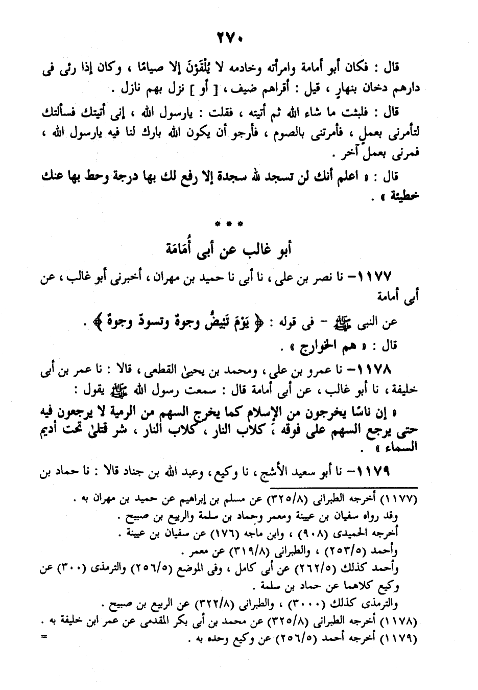1177 - نَا نَصْرُ بْنُ عَلِيٍّ، نَا أَبِي نَا حُمَيْدُ بْنُ مِهْرَانَ، أَخْبَرَنِي أَبُو غَالِبٍ عَنْ أَبِي أُمَامَةَ، عَنِ النَّبِيِّ صَلَّى اللهُ عَلَيْهِ وَسَلَّمَ فِي قَوْلِهِ: {§يَوْمَ تَبْيَضُّ وُجُوهٌ وَتَسْوَدُّ وُجُوهٌ} [آل عمران: 106] قَالَ: «هُمُ الْخَوَارِجُ»