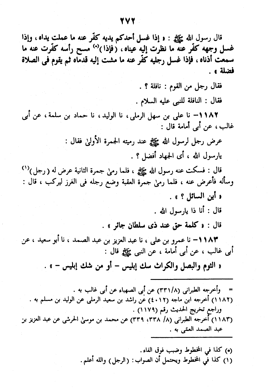 نَا عَلِيُّ بْنُ سَهْلٍ الرَّمْلِيُّ، نَا الْوَلِيدُ , نَا حَمَّادُ بْنُ سَلَمَةَ، عَنْ أَبِي غَالِبٍ عَنْ أَبِي أُمَامَةَ قَالَ: عَرَضَ رَجُلٌ لِرَسُولِ اللَّهِ صَلَّى اللهُ عَلَيْهِ وَسَلَّمَ عِنْدَ رَمَيْتِهِ الْجَمْرَةَ الْأُولَى، فَقَالَ: يَا رَسُولَ اللَّهِ، أَيُّ الْجِهَادِ أَفْضَلُ؟، قَالَ: فَسَكَتَ عَنْهُ رَسُولُ اللَّهِ صَلَّى اللهُ عَلَيْهِ وَسَلَّمَ. فَلَمَّا رَمَى جَمْرَةَ الثَّانِيَةِ عَرَضَ لَهُ رَجُلٌ وَسَأَلَهُ فَأَعْرَضَ عَنْهُ، فَلَمَّا رَمَى جَمْرَةَ الْعَقَبَةِ وَضَعَ رِجْلَهُ فِي الْغَرْزِ لِيَرْكَبَ قَالَ: «أَيْنَ السَّائِلُ؟» ، قَالَ: أَنَا ذَا يَا رَسُولَ اللَّهِ، قَالَ: «§كَلِمَةُ حَقٍّ عِنْدَ ذِي سُلْطَانٍ جَائِرٍ»