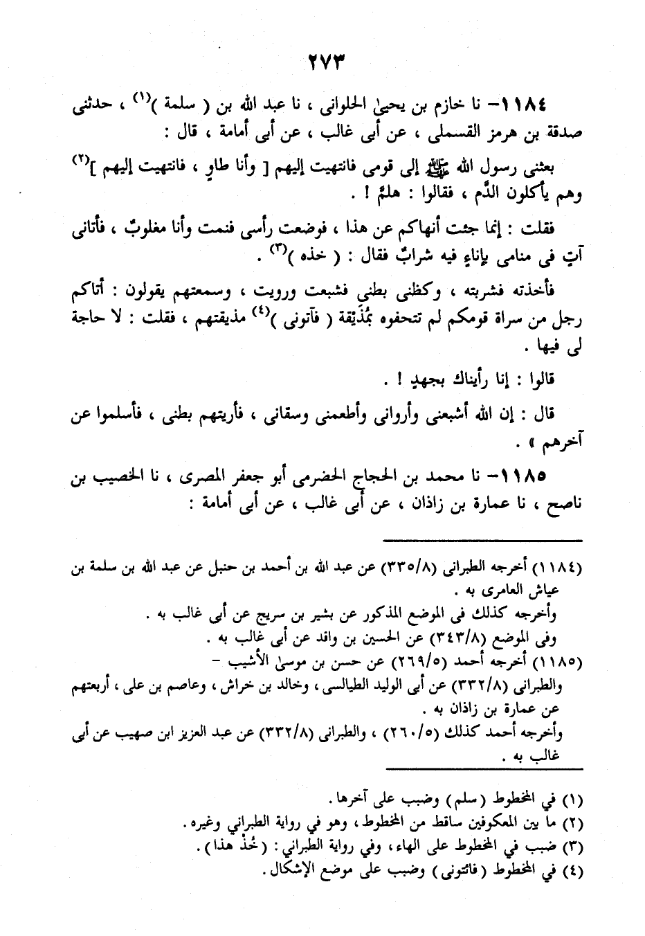نَا خَازِمُ بْنُ يَحْيَى الْحُلْوَانِيُّ، نَا عَبْدُ اللَّهِ بْنُ سَلَمَةَ، حَدَّثَنِي صَدَقَةُ بْنُ هُرْمُزَ الْقَسْمَلِيُّ، عَنْ أَبِي غَالِبٍ، عَنْ أَبِي أُمَامَةَ قَالَ: " بَعَثَنِي رَسُولُ اللَّهِ صَلَّى اللهُ عَلَيْهِ وَسَلَّمَ إِلَى قَوْمِي، فَانْتَهَيْتُ إِلَيْهِمْ وَأَنَا طَاوٍ، فَانْتَهَيْتُ إِلَيْهِمْ وَهُمْ يَأْكُلُونَ الدَّمَ، فَقَالُوا: هَلُمَّ، فَقُلْتُ: إِنَّمَا جِئْتُ أَنْهَاكُمْ عَنْ هَذَا، فَوَضَعْتُ رَأْسِي فَنِمْتُ وَأَنَا مَغْلُوبٌ، فَأَتَانِي آتٍ فِي مَنَامِي بِإِنَاءٍ فِيهِ شَرَابٌ، فَقَالَ: خُذْهُ، فَأَخَذْتُهُ فَشَرِبْتُهُ وَكَظَّنِي بَطْنِي فَشَبِعْتُ وَرَوِيتُ وَسَمِعْتُهُمْ يَقُولُونَ: أَتَاكُمْ رَجُلٌ مِنْ سَرَاةِ قَوْمِكُمْ لَمْ تُتْحِفُوهُ بِمُذَيْقَةٍ فَآتُونِي مُذَيْقَتَهُمْ، فَقُلْتُ: لَا حَاجَةَ لِي فِيهَا، قَالُوا: إِنَّا رَأَيْنَاكَ بِجَهْدٍ، قَالَ: إِنَّ §اللَّهَ أَشْبَعَنِي وَأَرْوَانِي، وَأَطْعَمَنِي وَسَقَانِي، فَأَرَيْتُهُمْ بَطْنِي فَأَسْلَمُوا عَنْ آخِرِهِمْ "