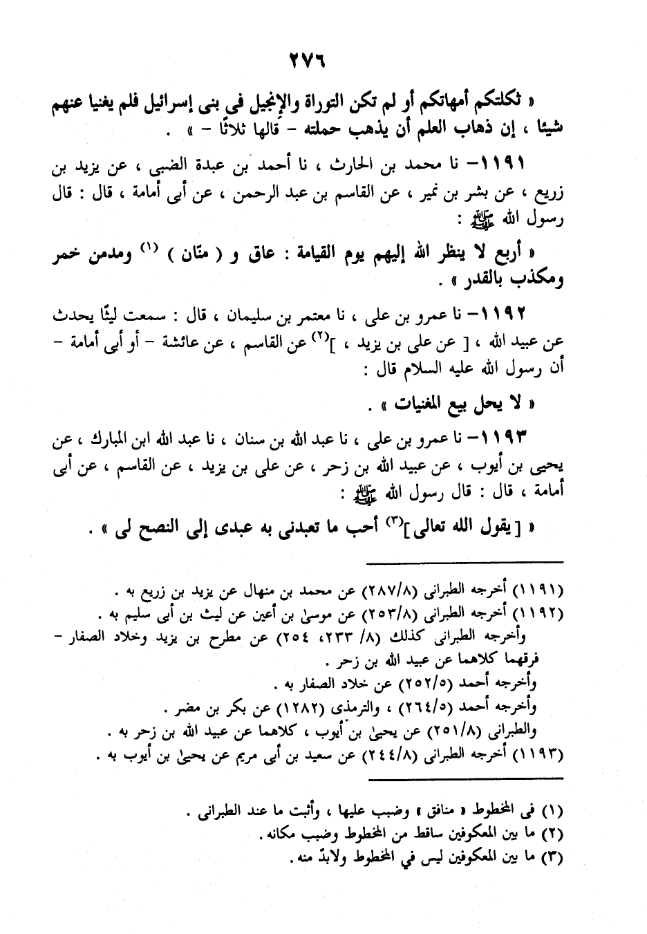 1191 - نَا مُحَمَّدُ بْنُ الْحَارِثِ، نَا أَحْمَدُ بْنُ عَبْدَةَ الضَّبِّيُّ، عَنْ يَزِيدَ بْنِ زُرَيْعٍ، عَنْ بِشْرِ بْنِ نُمَيْرٍ، عَنِ الْقَاسِمِ بْنِ عَبْدِ الرَّحْمَنِ , عَنْ أَبِي أُمَامَةَ قَالَ: قَالَ رَسُولُ اللَّهِ صَلَّى اللهُ عَلَيْهِ وَسَلَّمَ: " §أَرْبَعٌ لَا يَنْظُرُ اللَّهُ إِلَيْهِمْ يَوْمَ الْقِيَامَةِ: عَاقٌّ، وَمَنَّانٌ، وَمُدْمِنُ خَمْرٍ، وَمُكَذِّبٌ بِالْقَدَرِ "