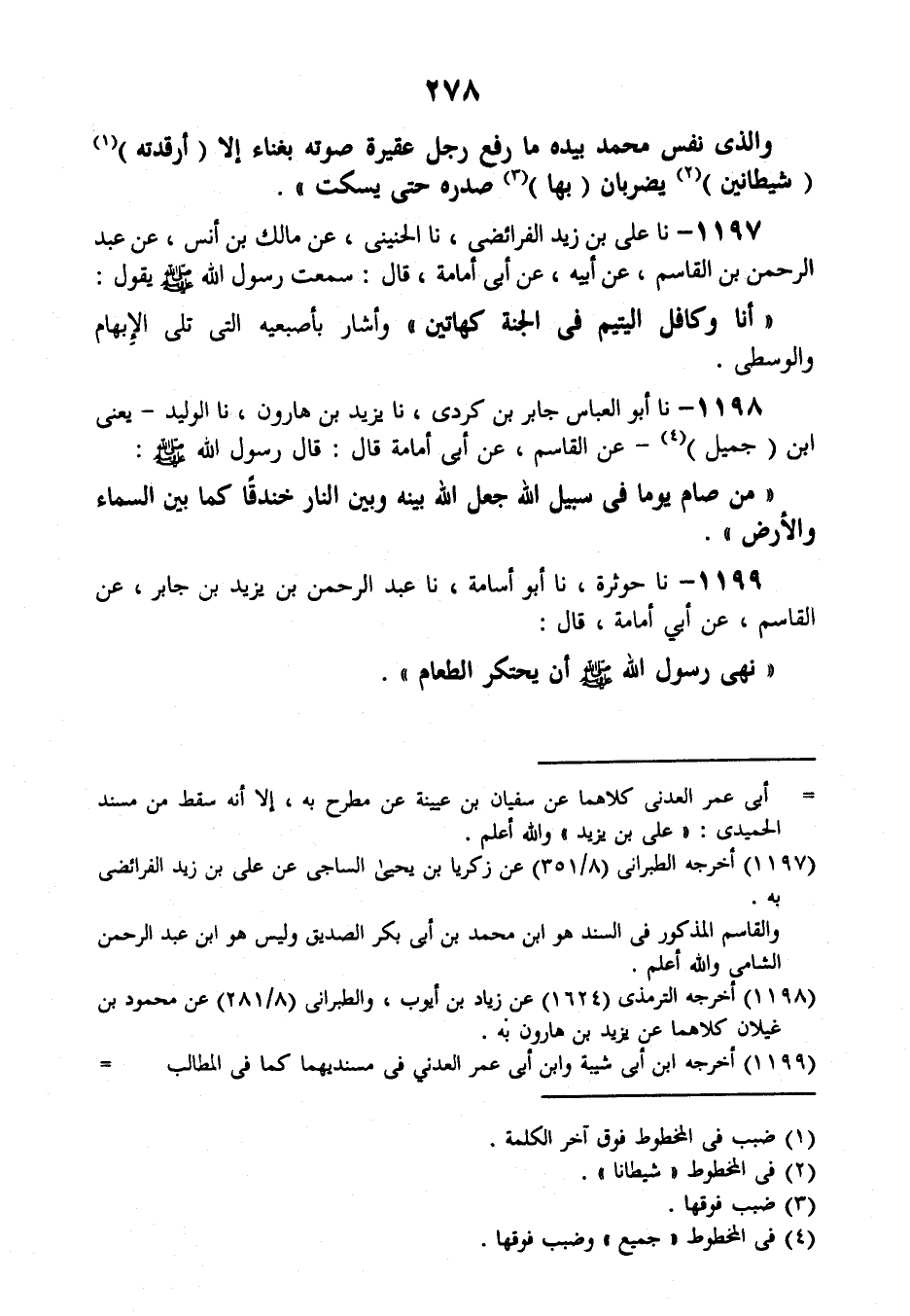 1197 - نَا عَلِيُّ بْنُ زَيْدٍ الْفَرَائِضِيُّ، نا الْحُنَيْنِيُّ، عَنْ مَالِكِ بْنِ أَنَسٍ، عَنْ عَبْدِ الرَّحْمَنِ بْنِ الْقَاسِمِ , عَنْ أَبِيهِ، عَنْ أَبِي أُمَامَةَ قَالَ: سَمِعْتُ رَسُولَ اللَّهِ صَلَّى اللهُ عَلَيْهِ وَسَلَّمَ يَقُولُ: «§أَنَا وَكَافِلُ الْيَتِيمِ فِي الْجَنَّةِ كَهَاتَيْنِ» وَأَشَارَ بِأُصْبُعَيْهِ الَّتِي تَلِي الْإِبْهَامَ وَالْوُسْطَى