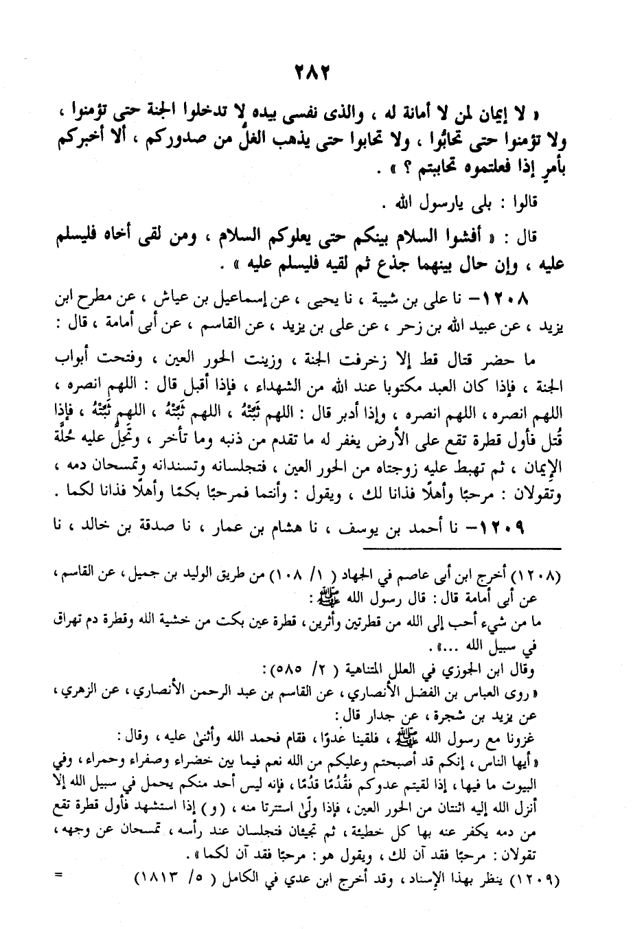 1208 - نَا عَلِيُّ بْنُ شَيْبَةَ، نَا يَحْيَى عَنْ إِسْمَاعِيلَ بْنِ عَيَّاشٍ، عَنْ مُطَّرِحِ بْنِ يَزِيدَ، عَنْ عُبَيْدِ اللَّهِ بْنِ زَحْرٍ، عَنْ عَلِيِّ بْنِ يَزِيدَ، عَنِ الْقَاسِمِ , عَنْ أَبِي أُمَامَةَ قَالَ: " §مَا حَضَرَ قِتَالٌ قَطُّ إِلَّا زُخْرِفَتِ الْجَنَّةُ وَزُيِّنَتِ الْحُورُ الْعِينُ، وَفُتِحَتْ أَبْوَابُ الْجَنَّةِ، فَإِذَا كَانَ الْعَبْدُ مَكْتُوبًا عِنْدَ اللَّهِ مِنَ الشُّهَدَاءِ، فَإِذَا أَقْبَلَ قَالَ: اللَّهُمَّ انْصُرْهُ، اللَّهُمَّ انْصُرْهُ، اللَّهُمَّ انْصُرْهُ، وَإِذَا أَدْبَرَ قَالَ: اللَّهُمَّ ثَبِّتْهُ، اللَّهُمَّ ثَبِّتْهُ، اللَّهُمَّ ثَبِّتْهُ، فَإِذَا قُتِلَ فَأَوَّلُ قَطْرَةٍ تَقَعُ عَلَى الْأَرْضِ يُغْفَرُ لَهُ مَا تَقَدَّمَ مِنْ ذَنْبِهِ وَمَا تَأَخَّرَ، وَتَحُلُّ عَلَيْهِ حُلَّةُ الْإِيمَانِ، ثُمَّ تَهْبِطُ عَلَيْهِ زَوْجَتَاهُ مِنَ الْحُورِ الْعِينِ، فَتُجْلِسَانِهِ وَتَسْنِدَانِهِ وَتَمْسَحَانِ دَمَهُ، وَتَقُولَانِ: مَرْحَبًا وَأَهْلًا فَذَانَا لَكَ، وَيَقُولُ: وَأَنْتَمَا فَمَرْحَبًا بِكُمَا وَأَهْلًا فَذَانَا لَكُمَا "