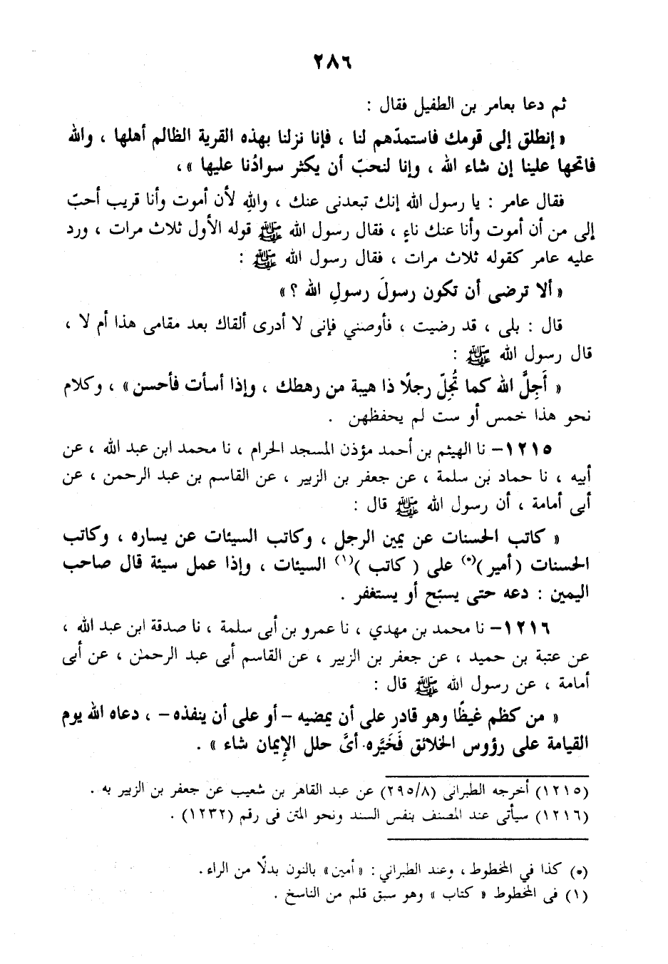 1215 - نَا الْهَيْثَمُ بْنُ أَحْمَدَ مُؤَذِّنُ الْمَسْجِدِ الْحَرَامِ، نَا مُحَمَّدُ بْنُ عَبْدِ اللَّهِ، عَنْ أَبِيهِ، نَا حَمَّادُ بْنُ سَلَمَةَ، عَنْ جَعْفَرِ بْنِ الزُّبَيْرِ، عَنِ الْقَاسِمِ بْنِ عَبْدِ الرَّحْمَنِ، عَنْ أَبِي أُمَامَةَ أَنَّ رَسُولَ اللَّهِ صَلَّى اللهُ عَلَيْهِ وَسَلَّمَ قَالَ: " §كَاتِبُ الْحَسَنَاتِ عَنْ يَمِينِ الرَّجُلِ، وَكَاتِبُ السَّيِّئَاتِ عَنْ يَسَارِهِ، وَكَاتِبُ الْحَسَنَاتِ أَمِيرٌ عَلَى كَاتِبِ السَّيِّئَاتِ، وَإِذَا عَمِلَ سَيِّئَةً قَالَ صَاحِبُ الْيَمِينِ: دَعْهُ حَتَّى يُسَبِّحَ أَوْ يَسْتَغْفِرَ "