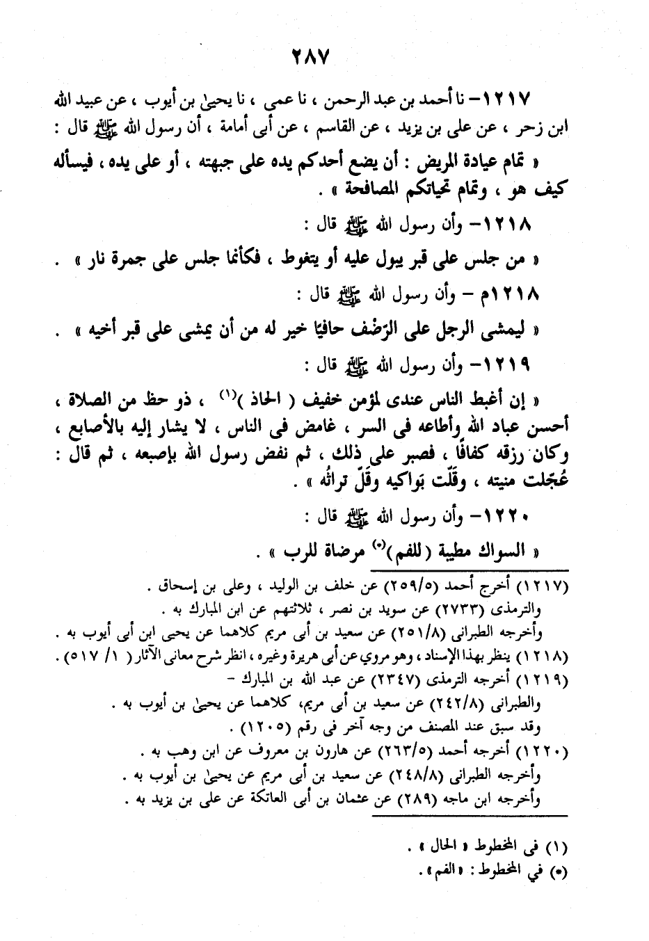 1220 - وَأَنَّ رَسُولَ اللَّهِ صَلَّى اللهُ عَلَيْهِ وَسَلَّمَ قَالَ: «§السِّوَاكُ مَطْيَبَةٌ لِلْفَمِ مَرْضَاةٌ لِلرَّبِّ»
