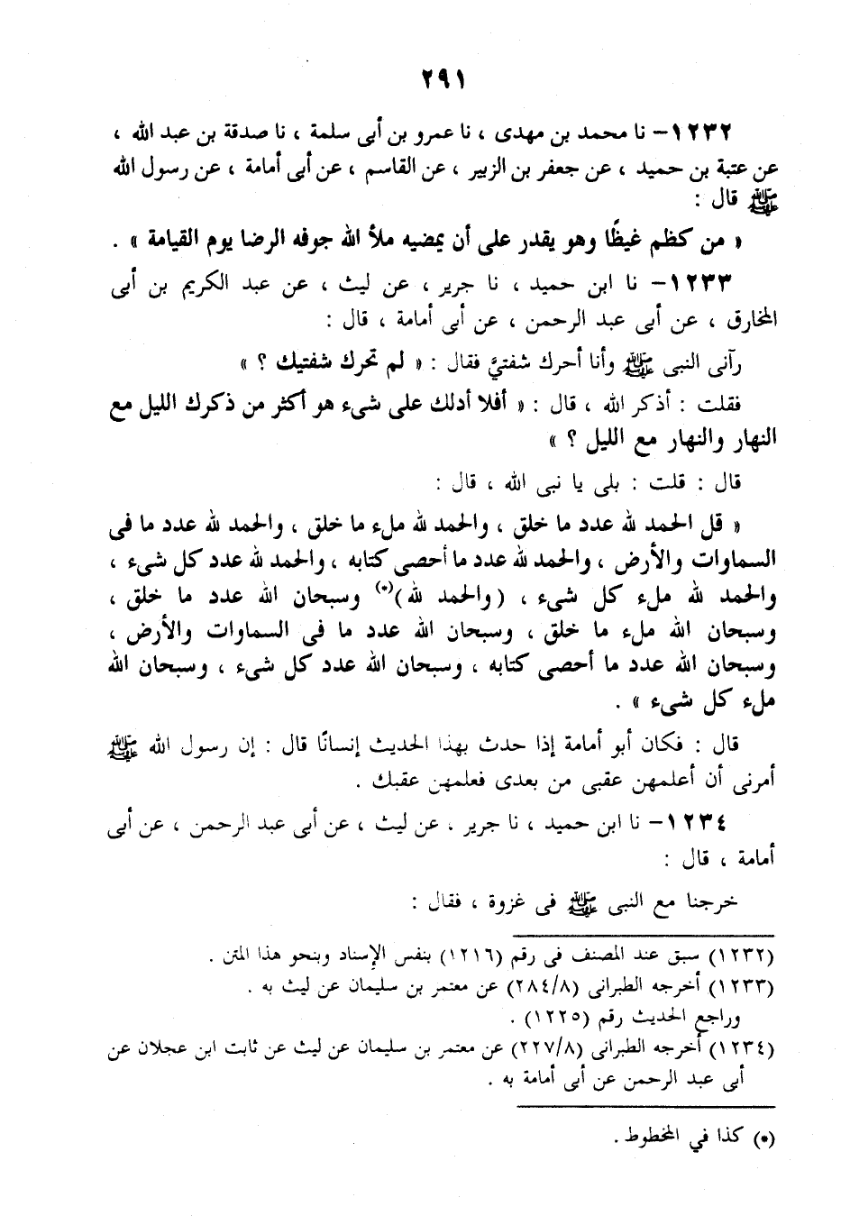 1233 - نَا ابْنُ حُمَيْدٍ، نَا جَرِيرٌ، عَنْ لَيْثٍ، عَنْ عَبْدِ الْكَرِيمِ بْنِ أَبِي الْمُخَارِقِ , عَنْ أَبِي عَبْدِ الرَّحْمَنِ , عَنْ أَبِي أُمَامَةَ قَالَ: رَآنِي النَّبِيُّ صَلَّى اللهُ عَلَيْهِ وَسَلَّمَ وَأَنَا أُحَرِّكُ شَفَتَيَّ، فَقَالَ: «لِمَ تُحَرِّكُ شَفَتَيْكَ؟» ، فَقُلْتُ: أَذَكَرُ اللَّهَ، قَالَ: أَفَلَا أَدُلُّكَ عَلَى شَيْءٍ هُوَ أَكْثَرُ مِنْ ذِكْرِكَ اللَّيْلَ مَعَ النَّهَارِ، وَالنَّهَارَ مَعَ اللَّيْلِ؟ "، قَالَ: قُلْتُ: بَلَى يَا نَبِيَّ اللَّهِ، قَالَ: «§قُلِ الْحَمْدُ لِلَّهِ عَدَدَ مَا خَلَقَ، وَالْحَمْدُ لِلَّهِ مِلْءَ مَا خَلَقَ، وَالْحَمْدُ لِلَّهِ عَدَدَ مَا فِي السَّمَاوَاتِ وَالْأَرْضِ، وَالْحَمْدُ لِلَّهِ عَدَدَ مَا أَحْصَى كِتَابُهُ، وَالْحَمْدُ لِلَّهِ عَدَدَ كُلِّ شَيْءٍ، وَالْحَمْدُ لِلَّهِ مِلْءَ كُلِّ شَيْءٍ، وَالْحَمْدُ لِلَّهِ وَسُبْحَانَ اللَّهِ عَدَدَ مَا خَلَقَ، وَسُبْحَانَ اللَّهِ مِلْءَ مَا خَلَقَ، وَسُبْحَانَ اللَّهِ عَدَدَ مَا فِي السَّمَاوَاتِ وَالْأَرْضِ، وَسُبْحَانَ اللَّهِ عَدَدَ مَا أَحْصَى كِتَابُهُ، وَسُبْحَانَ اللَّهِ عَدَدَ كُلِّ شَيْءٍ، وَسُبْحَانَ اللَّهِ مِلْءَ كُلِّ شَيْءٍ» ، قَالَ: فَكَانَ أَبُو أُمَامَةَ إِذَا حَدَّثَ بِهَذَا الْحَدِيثِ إِنْسَانًا قَالَ: إِنَّ رَسُولَ اللَّهِ صَلَّى اللهُ عَلَيْهِ وَسَلَّمَ أَمَرَنِي أَنْ أُعَلِّمَهُنَّ عَقِبِي مِنْ بَعْدِي فَعَلِّمْهُنَّ عَقِبَكَ
