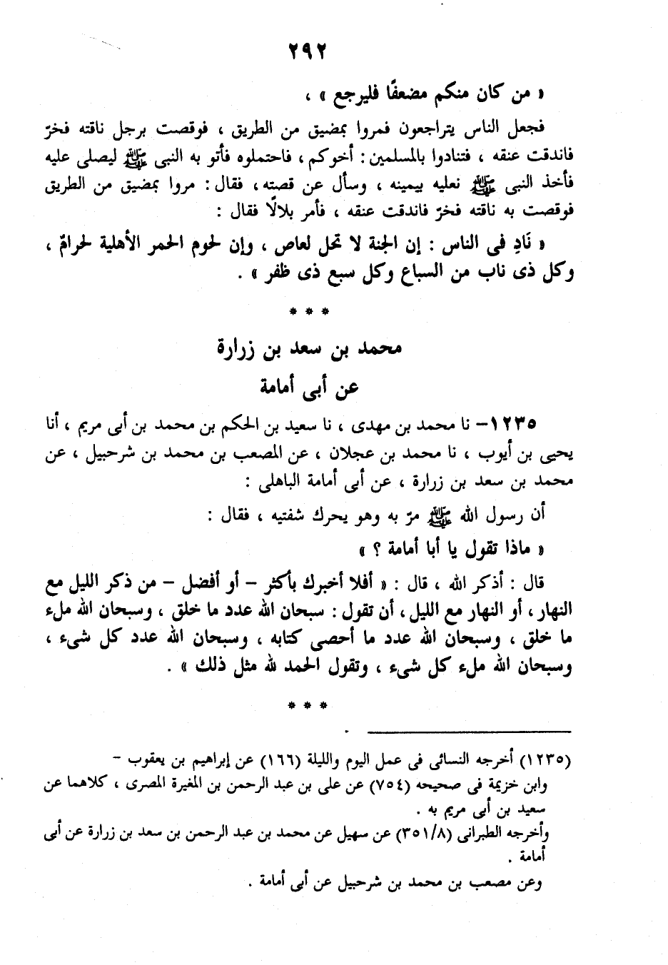 1235 - نَا مُحَمَّدُ بْنُ مَهْدِيٍّ، نَا سَعِيدُ بْنُ الْحَكَمِ بْنِ مُحَمَّدِ بْنِ أَبِي مَرْيَمَ، أنا يَحْيَى بْنُ أَيُّوبَ، نَا مُحَمَّدُ بْنُ عَجْلَانَ، عَنِ الْمُصْعَبِ بْنِ مُحَمَّدِ بْنِ شُرَحْبِيلَ , عَنْ مُحَمَّدِ بْنِ سَعْدِ بْنِ زُرَارَةَ، عَنْ أَبِي أُمَامَةَ الْبَاهِلِيِّ، أَنَّ رَسُولَ اللَّهِ صَلَّى اللهُ عَلَيْهِ وَسَلَّمَ مَرَّ بِهِ وَهُوَ يُحَرِّكُ شَفَتَيْهِ فَقَالَ: «مَاذَا تَقُولُ يَا أَبَا أُمَامَةَ؟» قَالَ: أَذْكُرُ اللَّهَ، قَالَ: أَفَلَا أُخْبِرُكَ بِأَكْثَرَ أَوْ أَفْضَلَ مِنْ ذِكْرِ اللَّيْلِ مَعَ النَّهَارِ أَوِ النَّهَارِ مَعَ اللَّيْلِ؟ أَنْ تَقُولَ: «§سُبْحَانَ اللَّهِ عَدَدَ مَا خَلَقَ، وَسُبْحَانَ اللَّهِ مِلْءَ مَا خَلَقَ، وَسُبْحَانَ اللَّهِ عَدَدَ مَا أَحْصَى كِتَابُهُ، وَسُبْحَانَ اللَّهِ عَدَدَ كُلِّ شَيْءٍ، وَسُبْحَانَ اللَّهِ مِلْءَ كُلِّ شَيْءٍ» ، وَتَقُولَ: «الْحَمْدُ لِلَّهِ مِثْلَ ذَلِكَ»