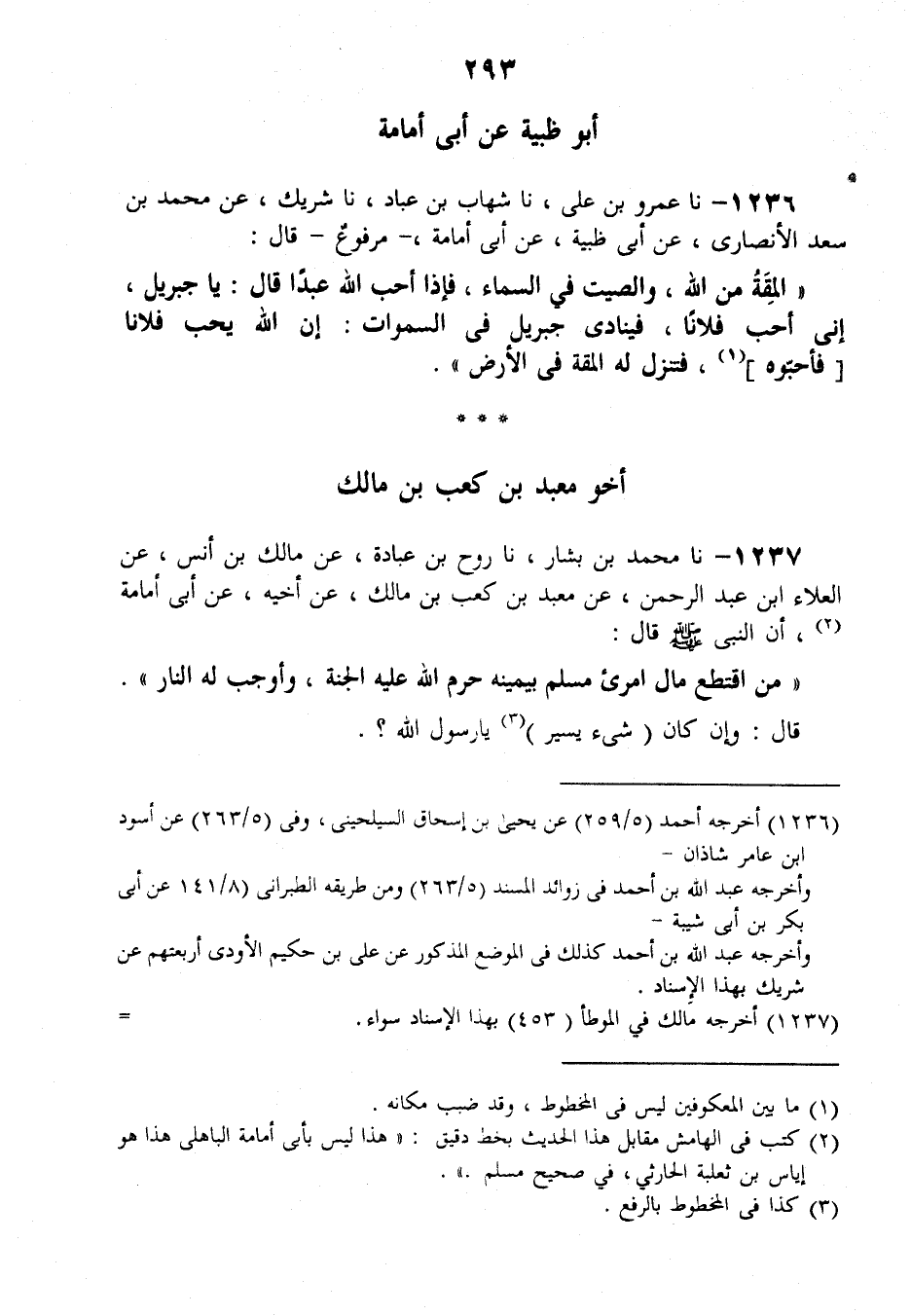 1237 - نَا مُحَمَّدُ بْنُ بَشَّارٍ، نَا رَوْحُ بْنُ عُبَادَةَ، عَنْ مَالِكِ بْنِ أَنَسٍ، عَنِ الْعَلَاءِ بْنِ عَبْدِ الرَّحْمَنِ , عَنْ مَعْبَدِ بْنِ كَعْبِ بْنِ مَالِكٍ، عَنْ أَخِيهِ عَنْ أَبِي أُمَامَةَ، أَنَّ النَّبِيَّ صَلَّى اللهُ عَلَيْهِ وَسَلَّمَ قَالَ: «§مَنِ اقْتَطَعَ مَالَ امْرِئٍ مُسْلِمٍ بِيَمِينِهِ حَرَّمَ اللَّهُ عَلَيْهِ الْجَنَّةَ وَأَوْجَبَ لَهُ النَّارَ» ، قَالَ: وَإِنْ كَانَ شَيْئًا يَسِيرًا يَا رَسُولَ اللَّهِ؟ قَالَ: «وَإِنْ كَانَ قَضِيبًا مِنْ أَرَاكٍ»
