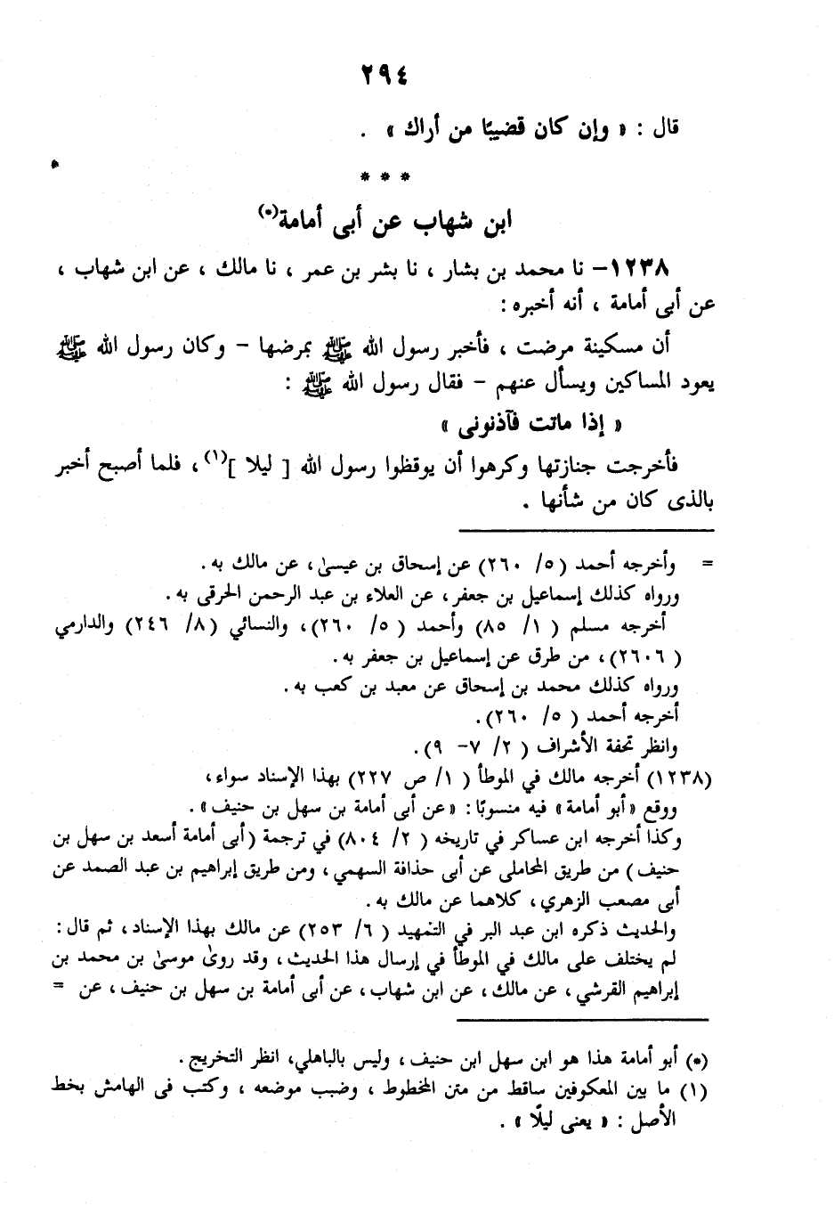 1238 - نَا مُحَمَّدُ بْنُ بَشَّارٍ، نَا بِشْرُ بْنُ عُمَرَ، نَا مَالِكٌ، عَنِ ابْنِ شِهَابٍ , عَنْ أَبِي أُمَامَةَ، أَنَّهُ أَخْبَرَهُ أَنَّ مِسْكِينَةً مَرِضَتْ فَأُخْبِرَ رَسُولُ اللَّهِ صَلَّى اللهُ عَلَيْهِ وَسَلَّمَ بِمَرَضِهَا، وَكَانَ رَسُولُ اللَّهِ صَلَّى اللهُ عَلَيْهِ وَسَلَّمَ يَعُودُ الْمَسَاكِينَ وَيَسْأَلُ عَنْهُمْ، فَقَالَ رَسُولُ اللَّهِ صَلَّى اللهُ عَلَيْهِ وَسَلَّمَ: «إِذَا مَاتَتْ فَآذِنُونِي» ، فَأُخْرِجَتْ جِنَازَتُهَا وَكَرِهُوا أَنْ يُوقِظُوا رَسُولَ اللَّهِ لَيْلًا، فَلَمَّا أَصْبَحَ أُخْبِرَ بِالَّذِي كَانَ مِنْ شَأْنِهَا -[295]-، قَالَ: «أَمَا أُمِرْتُمْ أَنْ تُؤْذِنُونِي بِهَا؟» قَالُوا: يَا رَسُولَ اللَّهِ، كَرِهْنَا أَنْ نُخْرِجَكَ لَيْلًا أَوْ نُوقِظَكَ، فَخَرَجَ رَسُولُ اللَّهِ حَتَّى §صَفَّ بِالنَّاسِ عَلَى قَبْرِهَا فَصَلَّى عَلَيْهَا، وَكَبَّرَ أَرْبَعَ تَكْبِيرَاتٍ