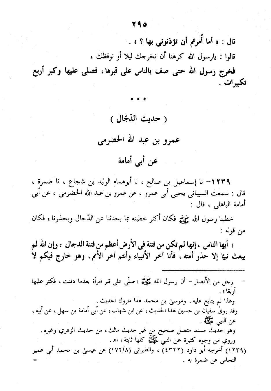 1239 - نَا إِسْمَاعِيلُ بْنُ صَالِحٍ، نَا أَبُو هَمَّامٍ الْوَلِيدُ بْنُ شُجَاعٍ، نَا ضَمْرَةُ، قَالَ: سَمِعْتُ السَّيْبَانِيَّ يَحْيَى أَبَا عَمْرٍو، عَنْ عَمْرِو بْنِ عَبْدِ اللَّهِ الْحَضْرَمِيِّ، عَنْ أَبِي أُمَامَةَ الْبَاهِلِيِّ قَالَ: خَطَبَنَا رَسُولُ اللَّهِ صَلَّى اللهُ عَلَيْهِ وَسَلَّمَ فَكَانَ أَكْثَرُ خُطْبَتِهِ بِمَا يُحَدِّثُنَا عَنِ الدَّجَّالِ وَيُحَذِّرُنَا، فَكَانَ مِنْ قَوْلِهِ: " أَيُّهَا النَّاسُ إِنَّهَا §لَمْ تَكُنْ مِنْ فِتْنَةٍ فِي الْأَرْضِ أَعْظَمَ مِنْ فِتْنَةِ الدَّجَّالِ، وَإِنَّ اللَّهَ لَمْ يَبْعَثْ نَبِيًّا إِلَّا حَذَّرَ أُمَّتَهُ، فَأَنَا آخِرُ الْأَنْبِيَاءِ، وَأَنْتُمْ آخِرُ الْأُمَمِ، وَهُوَ خَارِجٌ فِيكُمْ لَا -[296]- مَحَالَةَ، فَإِنْ يَخْرُجْ وَأَنَا فِيكُمْ فَأَنَا حَجِيجُ كُلِّ مُسْلِمٍ، وَإِنْ يَخْرُجْ بَعْدِي فَكُلُّ امْرِئٍ حَجِيجُ نَفْسِهِ، وَاللَّهُ خَلِيفَتِي عَلَى كُلِّ مُسْلِمٍ، إِنَّهُ يَخْرُجُ مِنْ خَلَّةٍ بَيْنَ الشَّامِ وَالْعِرَاقِ فَيَأْخُذُ يَمِينًا وَشِمَالًا، يَا عِبَادَ اللَّهِ فَاثْبُتُوا، فَإِنَّهُ يَبْدَأُ فَيَقُولُ: أَنَا نَبِيٌّ وَلَا نَبِيَّ بَعْدِي، ثُمَّ يُثَنِّي فَيَقُولُ: أَنَا رَبُّكُمْ وَلَنْ تَرَوْا رَبَّكُمْ حَتَّى تَمُوتُوا، وَإِنَّهُ أَعْوَرُ وَلَيْسَ رَبُّكُمْ بِأَعْوَرَ، وَإِنَّهُ مَكْتُوبٌ بَيْنَ عَيْنَيْهِ كَافِرٌ يَقْرَأُهُ كُلُّ مُؤْمِنٍ فَمَنْ لَقِيَهُ مِنْكُمْ فَلْيَتْفُلْ فِي وَجْهِهِ، وَإِنِّ مِنْ فِتْنَتِهِ أَنَّ مَعَهُ جَنَّةً وَنَارًا فَنَارُهُ جَنَّةٌ وَجَنَّتُهُ نَارٌ، فَمَنِ ابْتُلِيَ بِنَارِهِ فَلْيَقْرَأْ بِفَوَاتِحِ سُورَةِ الْكَهْفِ وَيَسْتَغِثْ بِاللَّهِ فَتَكُونَ عَلَيْهِ بَرْدًا وَسَلَامًا كَمَا كَانَتْ عَلَى إِبْرَاهِيمَ، وَإِنَّ مِنْ فِتْنَتِهِ أَنَّ مَعَهُ شَيَاطِينَ تَمَثَّلُ لَهُ عَلَى صُوَرِ النَّاسِ فَيَأْتِي الْأَعْرَابِيُّ فَيَقُولُ: أَرَأَيْتَ إِنْ بَعَثَنَا لَكَ أَبَاكَ وَأُمَّكَ تَشَهَدُ أَنِّي رَبُّكَ؟ فَيَقُولُ: نَعَمْ. فَيُمَثِّلُ شَيْطَانَهُ عَلَى صُورَةِ أَبِيهِ وَأُمِّهِ فَيَقُولَانِ لَهُ: اتَّبِعْهُ فَإِنَّهُ رَبُّكَ. وَإِنَّ مِنْ فِتْنَتِهِ أَنْ يُسَلَّطَ عَلَى نَفْسٍ فَيَقْتُلَهَا ثُمَّ يُحْيِيَهَا وَلَنْ يَعُودَ لَهَا بَعْدَ ذَلِكَ وَلَا يَصْنَعُ ذَلِكَ بِنَفْسٍ غَيْرِهَا، فَيَقُولُ: انْظُرُوا إِلَى عَبْدِي هَذَا فَإِنِّي أَبْعَثُهُ الْآنَ وَيَزْعُمُ أَنَّ لَهُ رَبًّا غَيْرَى، فَيَبْعَثُهُ فَيَقُولُ: مَنْ رَبُّكَ؟ فَيَقُولُ: رَبِّيَ اللَّهُ، وَأَنْتَ الدَّجَّالُ الْكَافِرُ عَدُوُّ اللَّهِ. وَإِنَّ مِنْ فِتْنَتِهِ أَنْ يَقُولَ لِأَعْرَابِيِّ: أَرَأَيْتَ إِنْ بَعَثْتُ لَكَ إِبِلَكَ فَتَشَهَدُ أَنِّي رَبُّكَ؟ فَيَقُولُ: نَعَمْ. فَيَتَمَثَّلُ لَهُ شَيْطَانُهُ عَلَى صُورَةِ إِبِلِهِ -[297]-، وَإِنَّ مِنْ فِتْنَتِهِ أَنْ يَأْمُرَ السَّمَاءَ أَنْ تُمْطِرَ فَتُمْطِرَ، وَيَأْمُرَ الْأَرْضَ أَنْ تُنْبِتَ فَتُنْبِتَ فَتَرُوحُ إِلَيْهِمْ مَوَاشِيهِمْ مِنْ يَوْمِهِمْ ذَلِكَ أَعْظَمَ مَا كَانَتْ وَأَسْمَنَهُ، أَمَدَّهُ خَوَاصِرَ وَأَدَرَّهُ ضُرُوعًا، وَإِنَّ أَيَّامَهُ أَرْبَعُونَ يَوْمًا؛ فَيَوْمٌ كَالسَّنَةِ، وَيَوْمٌ دُونَ ذَلِكَ، وَيَوْمٌ كَالْأَيَّامِ وَيَوْمٌ دُونَ ذَلِكَ، وَيَوْمٌ كَالشَّهْرِ، وَيَوْمٌ دُونَ ذَلِكَ، وَيَوْمٌ كَالْجُمُعَةِ، وَيَوْمٌ دُونَ ذَلِكَ، وَآخِرُ أَيَّامِهِ كَالشَّرَرِ فِي الْجَرِيدَةِ، يُصْبِحُ الرَّجُلُ بِبَابِ الْمَدِينَةِ فَلَا يَبْلُغُ بَابَهَا الْآخَرَ حَتَّى تَغِيبَ الشَّمْسُ ". فَقِيلَ: يَا رَسُولَ اللَّهِ، كَيْفَ نُصَلِّي فِي تِلْكَ الْأَيَّامِ الْقِصَارِ؟ قَالَ: " تَعُدُّونَ فِيهَا كَمَا تَعُدُّونَ ف