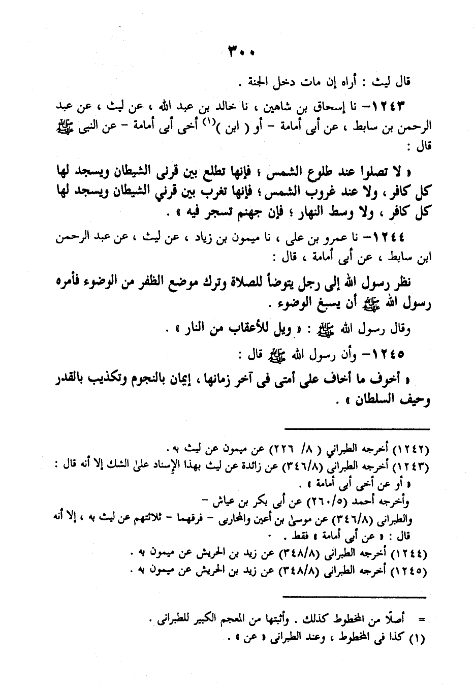 1243 - نَا إِسْحَاقُ بْنُ شَاهِينَ، نَا خَالِدُ بْنُ عَبْدِ اللَّهِ، عَنْ لَيْثٍ، عَنْ عَبْدِ الرَّحْمَنِ بْنِ سَابِطٍ , عَنْ أَبِي أُمَامَةَ، أَوِ ابْنِ أَخِي أَبِي أُمَامَةَ عَنِ النَّبِيِّ صَلَّى اللهُ عَلَيْهِ وَسَلَّمَ قَالَ: «§لَا تُصَلُّوا عِنْدَ طُلُوعِ الشَّمْسِ؛ فَإِنَّهَا تَطْلُعُ بَيْنَ قَرْنَيِ الشَّيْطَانِ، وَيَسْجُدُ لَهَا كُلُّ كَافِرٍ، وَلَا عِنْدَ غُرُوبِ الشَّمْسِ فَإِنَّهَا تَغْرُبُ بَيْنَ قَرْنَيِ الشَّيْطَانِ وَيَسْجُدُ لَهَا كُلُّ كَافِرٍ، وَلَا وَسَطَ النَّهَارِ؛ فَإِنَّ جَهَنَّمَ تُسَجَّرُ فِيهِ»