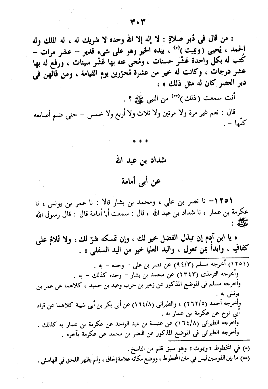 1251 - نَا نَصْرُ بْنُ عَلِيٍّ، وَمُحَمَّدُ بْنُ بَشَّارٍ قَالَا: نَا عُمَرُ بْنُ يُونُسَ، نَا عِكْرِمَةُ بْنُ عَمَّارٍ، نَا شَدَّادُ بْنُ عَبْدِ اللَّهِ قَالَ: سَمِعْتُ أَبَا أُمَامَةَ قَالَ: قَالَ رَسُولُ اللَّهِ صَلَّى اللهُ عَلَيْهِ وَسَلَّمَ: «يَا ابْنَ آدَمَ، §إِنْ تَبْذُلِ الْفَضْلَ خَيْرٌ لَكَ، وَإِنْ تُمْسِكْهُ شَرٌّ لَكَ، وَلَا تُلَامُ عَلَى كَفَافٍ، وَابْدَأْ بِمَنْ تَعُولُ، وَالْيَدُ الْعُلْيَا خَيْرٌ مِنَ الْيَدِ السُّفْلَى»