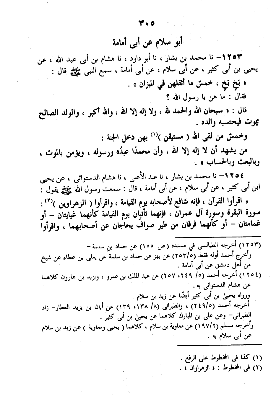 1254 - نَا مُحَمَّدُ بْنُ بَشَّارٍ، نَا عَبْدُ الْأَعْلَى , نَا هِشَامٌ الدَّسْتُوَائِيُّ، عَنْ يَحْيَى بْنِ أَبِي كَثِيرٍ، عَنْ أَبِي سَلَّامٍ , عَنْ أَبِي أُمَامَةَ قَالَ: سَمِعْتُ رَسُولَ اللَّهِ صَلَّى اللهُ عَلَيْهِ وَسَلَّمَ يَقُولُ: «§اقْرَءُوا الْقُرْآنَ؛ فَإِنَّهُ شَافِعٌ لِأَصْحَابِهِ يَوْمَ الْقِيَامَةِ، وَاقْرَءُوا الزَّهْرَاوَيْنِ سُورَةَ الْبَقَرَةِ وَسُورَةَ آلِ عِمْرَانَ؛ فَإِنَّهُمَا تَأْتِيَانِ يَوْمَ الْقِيَامَةِ كَأَنَّهُمَا غَيَايَتَانِ أَوْ غَمَامَتَانِ، أَوْ كَأَنَّهُمَا فِرْقَانِ مِنْ طَيْرٍ صَوَافَّ يُحَاجَّانِ عَنْ أَصْحَابِهِمَا، وَاقْرَءُوا سُورَةَ الْبَقَرَةِ فَإِنَّ أَخْذَهَا بَرَكَةٌ، وَتَرْكَهَا حَسْرَةٌ، وَلَا يَسْتَطِيعُهَا الْبَطَلَةُ»
