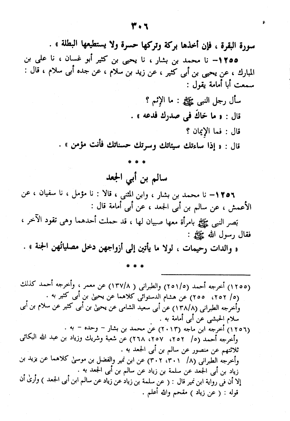 1256 - نَا مُحَمَّدُ بْنُ بَشَّارٍ، وَابْنُ الْمُثَنَّى، قَالَا: نَا مُؤَمَّلٌ، نَا سُفْيَانُ، عَنِ الْأَعْمَشِ , عَنْ سَالِمِ بْنِ أَبِي الْجَعْدِ، عَنْ أَبِي أُمَامَةَ قَالَ: بَصُرَ النَّبِيُّ صَلَّى اللهُ عَلَيْهِ وَسَلَّمَ بِامْرَأَةٍ مَعَهَا صَبِيَّانِ لَهَا قَدْ حَمَلَتْ أَحَدَهُمَا وَهِيَ تَقُودُ الْآخَرَ، فَقَالَ رَسُولُ اللَّهِ صَلَّى اللهُ عَلَيْهِ وَسَلَّمَ: «§وَالِدَاتٌ رَحِيمَاتٌ، لَوْلَا مَا يَأْتِينَ إِلَى أَزْوَاجِهِنَّ دَخَلَ مُصَلِّيَاتُهُنَّ الْجَنَّةَ»