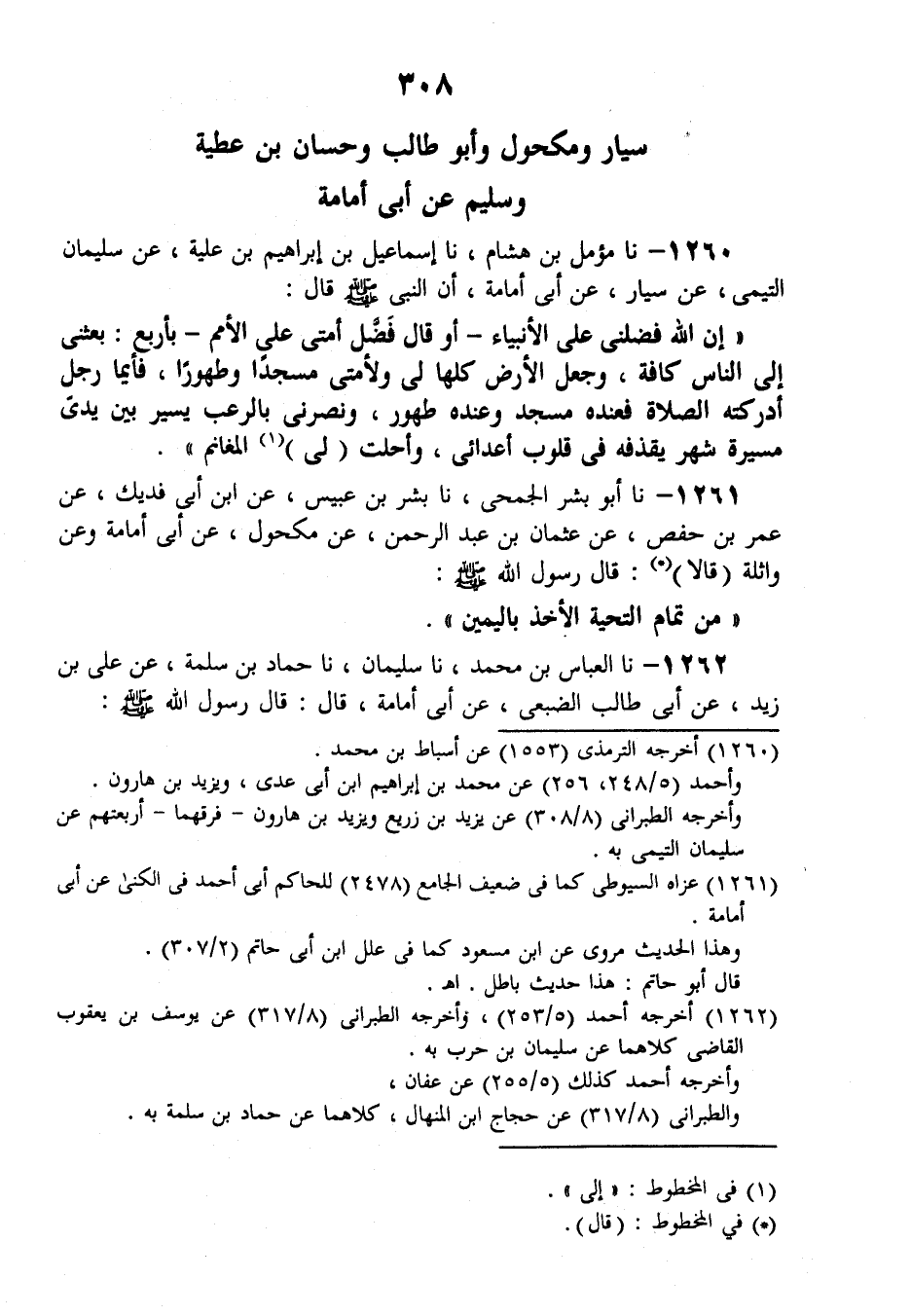 1260 - نَا مُؤَمَّلُ بْنُ هِشَامٍ، نَا إِسْمَاعِيلُ بْنُ إِبْرَاهِيمَ بْنِ عُلَيَّةَ، عَنْ سُلَيْمَانَ التَّيْمِيِّ، عَنْ سَيَّارٍ، عَنْ أَبِي أُمَامَةَ، أَنَّ النَّبِيَّ صَلَّى اللهُ عَلَيْهِ وَسَلَّمَ قَالَ: «إِنَّ §اللَّهَ فَضَّلَنِي عَلَى الْأَنْبِيَاءِ» أَوْ قَالَ: " فَضَّلَ أُمَّتِي عَلَى الْأُمَمِ بِأَرْبَعٍ: بَعَثَنِي إِلَى النَّاسِ كَافَّةً، وَجَعَلَ الْأَرْضَ كُلَّهَا لِي وَلِأُمَّتِي مَسْجِدًا وَطَهُورًا، فَأَيُّمَا رَجُلٍ أَدْرَكَتْهُ الصَّلَاةُ فَعِنْدَهُ مَسْجِدٌ، وَعِنْدَهُ طَهُورٌ، وَنَصَرَنِي بِالرُّعْبِ يَسِيرُ بَيْنَ يَدَيَّ مَسِيرَةَ شَهْرٍ يَقْذِفُهُ فِي قُلُوبِ أَعْدَائِي، وَأُحِلَّتْ لِيَ الْمَغَانِمُ "