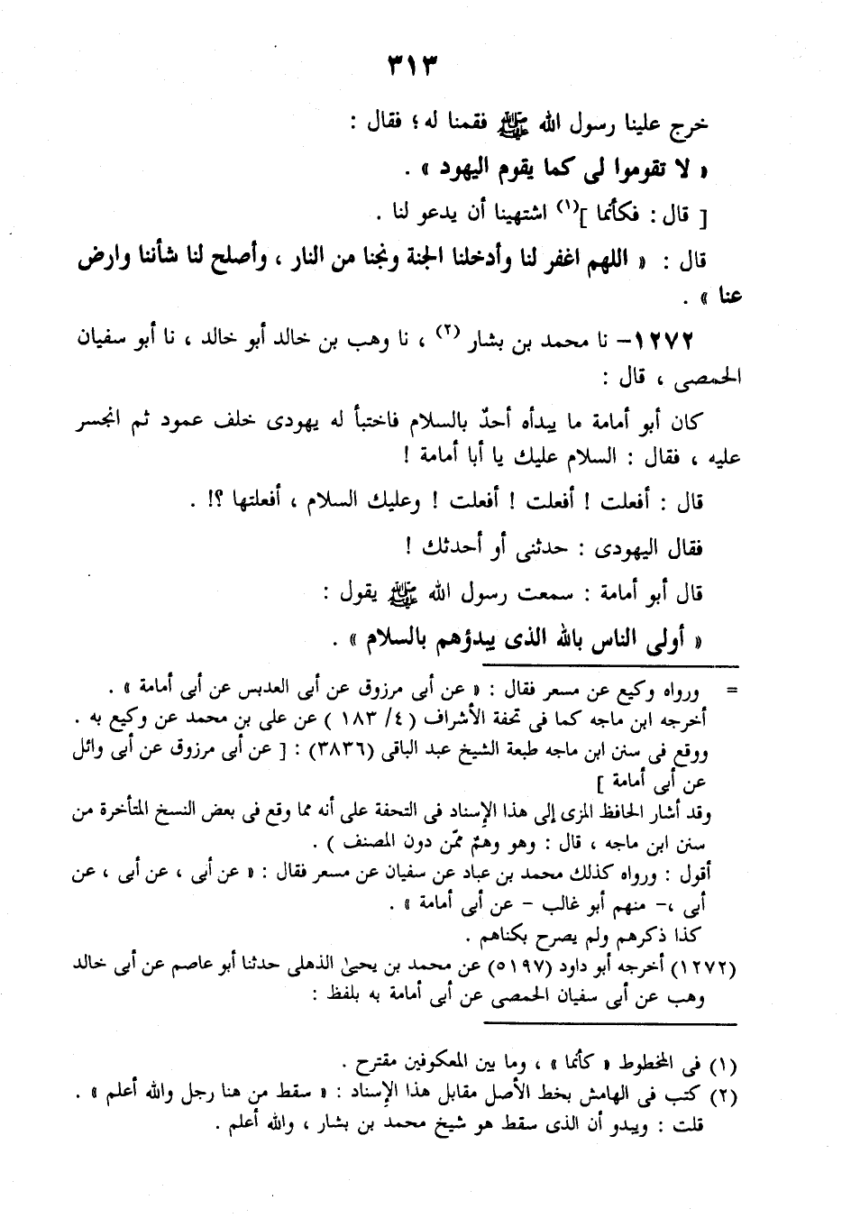 1272 - نَا مُحَمَّدُ بْنُ بَشَّارٍ، نَا وَهْبُ بْنُ خَالِدٍ أَبُو خَالِدٍ، نَا أَبُو سُفْيَانَ الْحِمْصِيُّ , قَالَ: كَانَ أَبُو أُمَامَةَ مَا يَبْدَؤُهُ أَحَدٌ بِالسَّلَامِ، فَاخْتَبَأَ لَهُ يَهُودِيٌّ خَلْفَ عَمُودٍ ثُمَّ انْجَسَرَ عَلَيْهِ، فَقَالَ: السَّلَامُ عَلَيْكَ يَا أَبَا أُمَامَةَ، قَالَ: أَفَعَلْتَ؟ أَفَعَلْتَ؟ أَفَعَلْتَ؟ وَعَلَيْكَ السَّلَامُ، أَفَعَلْتَهَا؟ فَقَالَ الْيَهُودِيُّ: حَدِّثْنِي أَوْ أُحَدِّثُكَ، قَالَ أَبُو أُمَامَةَ: سَمِعْتُ رَسُولَ اللَّهِ صَلَّى اللهُ عَلَيْهِ وَسَلَّمَ يَقُولُ: «§أَوْلَى النَّاسِ بِاللَّهِ الَّذِي يَبْدَؤُهُمْ بِالسَّلَامِ» -[314]-، قَالَ الْيَهُودِيُّ: إِنَّ فِي التَّوْرَاةِ الَّتِي أَنْزَلَهَا اللَّهُ عَلَى مُوسَى عَلَيْهِ السَّلَامُ لَمَكْتُوبٌ: إِنَّ الَّذِي يَبْدَأُ بِالسَّلَامِ فَقَدْ أَرْبَى