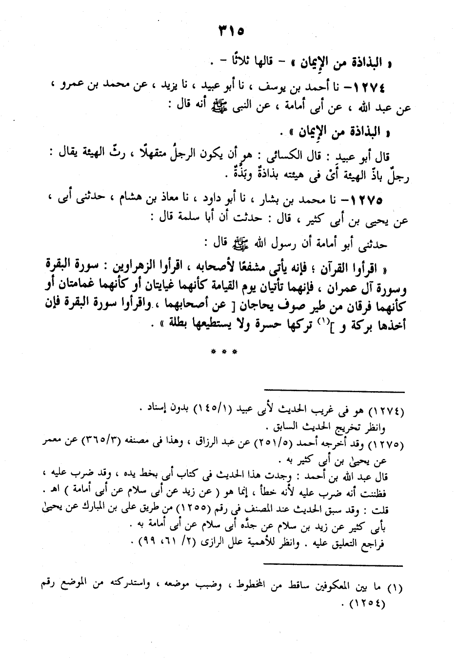 1275 - نَا مُحَمَّدُ بْنُ بَشَّارٍ، نَا أَبُو دَاوُدَ , نَا مُعَاذُ بْنُ هِشَامٍ، حَدَّثَنِي أَبِي عَنْ يَحْيَى بْنِ أَبِي كَثِيرٍ قَالَ: حُدِّثْتُ أَنَّ أَبَا سَلَمَةَ قَالَ: حَدَّثَنِي أَبُو أُمَامَةَ أَنَّ رَسُولَ اللَّهِ صَلَّى اللهُ عَلَيْهِ وَسَلَّمَ قَالَ: «§اقْرَءُوا الْقُرْآنَ فَإِنَّهُ يَأْتِي مُشَفَّعًا لِأَصْحَابِهِ، اقْرَءُوا الزَّهْرَاوَيْنِ سُورَةَ الْبَقَرَةِ وَسُورَةَ آلِ عِمْرَانَ؛ فَإِنَّهُمَا تَأْتِيَانِ يَوْمَ الْقِيَامَةِ كَأَنَّهُمَا غَيَايَتَانِ، أَوْ كَأَنَّهُمَا غَمَامَتَانِ، أَوْ كَأَنَّهُمَا فِرْقَانِ مِنْ طَيْرٍ صَوَافَّ يُحَاجَّانِ عَنْ أَصْحَابِهِمَا، وَاقْرَءُوا سُورَةَ الْبَقَرَةِ فَإِنَّ أَخْذَهَا بَرَكَةٌ، وَتَرْكَهَا حَسْرَةٌ وَلَا يَسْتَطِيعُهَا بَطَلَةٌ»