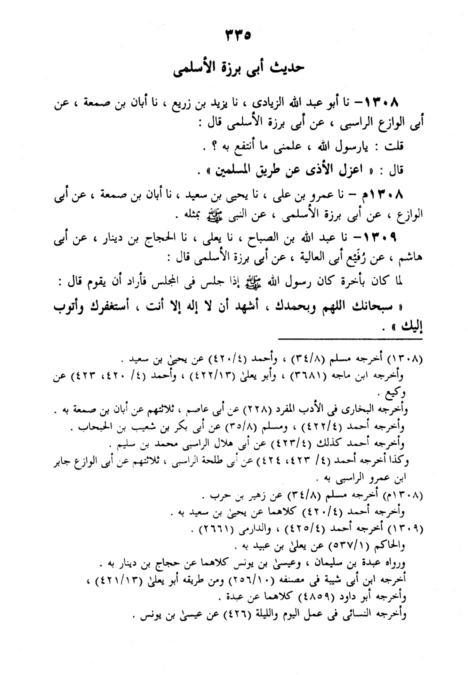 1309 - نَا عَبْدُ اللَّهِ بْنُ الصَّبَّاحِ , نَا يَعْلَى، نَا الْحَجَّاجُ بْنُ دِينَارٍ , عَنْ أَبِي هَاشِمٍ , عَنْ رُفَيْعٍ أَبِي الْعَالِيَةِ، عَنْ أَبِي بَرْزَةَ الْأَسْلَمِيِّ قَالَ: لَمَّا كَانَ بِأَخَرَةٍ كَانَ رَسُولُ اللَّهِ صَلَّى اللهُ عَلَيْهِ وَسَلَّمَ إِذَا جَلَسَ فِي الْمَجْلِسِ فَأَرَادَ أَنْ يَقُومَ قَالَ: «§سُبْحَانَكَ اللَّهُمَّ وَبِحَمْدِكَ، أَشْهَدُ أَنْ لَا إِلَهَ إِلَّا أَنْتَ، أَسْتَغْفِرُكُ وَأَتُوبُ إِلَيْكَ» -[336]-، قَالُوا: يَا رَسُولَ اللَّهِ، إِنَّكَ لَتَقُولُ كَلَامًا مَا كُنْتَ تَقُولُهَا فِيمَا خَلَا، فَقَالَ: «هَذَا كَفَّارَةُ مَا يَكُونُ فِي الْمَجَالِسِ»