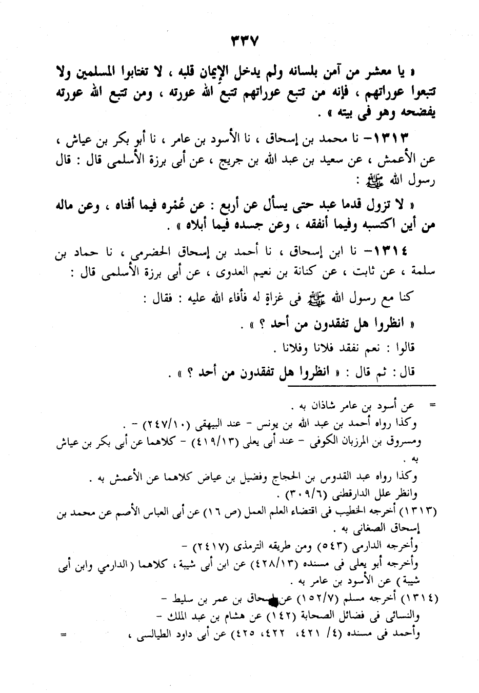 1313 - نَا مُحَمَّدُ بْنُ إِسْحَاقَ، نَا الْأَسْوَدُ بْنُ عَامِرٍ , نَا أَبُو بَكْرِ بْنُ عَيَّاشٍ , عَنِ الْأَعْمَشِ , عَنْ سَعِيدِ بْنِ عَبْدِ اللَّهِ بْنِ جُرَيْجٍ، عَنْ أَبِي بَرْزَةَ الْأَسْلَمِيِّ قَالَ: قَالَ رَسُولُ اللَّهِ صَلَّى اللهُ عَلَيْهِ وَسَلَّمَ: " §لَا تَزُولُ قَدَمَا عَبْدٍ حَتَّى يُسْأَلَ عَنْ أَرْبَعٍ: عَنْ عُمْرِهِ فِيمَا أَفْنَاهُ، وَعَنْ مَالِهِ مِنْ أَيْنَ اكْتَسَبَهُ وَفِيمَا أَنْفَقَهُ؟، وَعَنْ جَسَدِهِ فِيمَا أَبْلَاهُ "