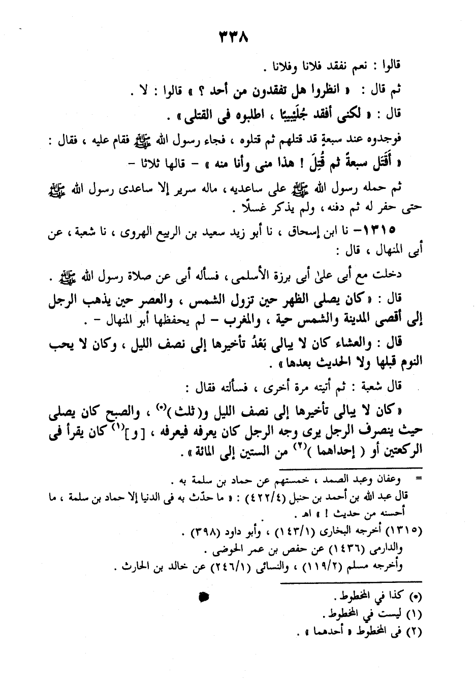 1315 - نَا ابْنُ إِسْحَاقَ , نَا أَبُو زَيْدٍ سَعِيدُ بْنُ الرَّبِيعِ الْهَرَوِيُّ، نَا شُعْبَةُ، عَنْ أَبِي الْمِنْهَالِ , قَالَ: دَخَلْتُ مَعَ أَبِي عَلَى أَبِي بَرْزَةَ الْأَسْلَمِيِّ فَسَأَلَهُ أَبِي عَنْ صَلَاةِ رَسُولِ اللَّهِ صَلَّى اللهُ عَلَيْهِ وَسَلَّمَ قَالَ: كَانَ §يُصَلِّي الظُّهْرَ حِينَ تَزُولُ الشَّمْسُ، وَالْعَصْرَ حِينَ يَذْهَبُ الرَّجُلُ إِلَى أَقْصَى الْمَدِينَةِ وَالشَّمْسُ حَيَّةٌ، وَالْمَغْرِبُ لَمْ يَحْفَظْهَا أَبُو الْمِنْهَالِ قَالَ: وَالْعِشَاءُ كَانَ لَا يُبَالِي بَعْدُ تَأْخِيرَهَا إِلَى نِصْفِ اللَّيْلِ، وَكَانَ لَا يُحِبُّ النَّوْمَ قَبْلَهَا، وَلَا الْحَدِيثَ بَعْدَهَا، قَالَ شُعْبَةُ: ثُمَّ أَتَيْتُهُ مَرَّةً أُخْرَى فَسَأَلْتُهُ، فَقَالَ: كَانَ لَا يُبَالِي تَأْخِيرَهَا إِلَى نِصْفِ اللَّيْلِ وَثُلُثٍ، وَالصُّبْحُ كَانَ يُصَلِّي حَيْثُ يَنْصَرِفُ الرَّجُلُ يَرَى وَجْهَ الرَّجُلِ كَانَ يَعْرِفُهُ فَيَعْرِفُهُ، وَكَانَ يَقْرَأُ فِي الرَّكْعَتَيْنِ أَوْ إِحْدَاهُمَا مِنَ السِّتِّينَ إِلَى الْمِائَةِ "