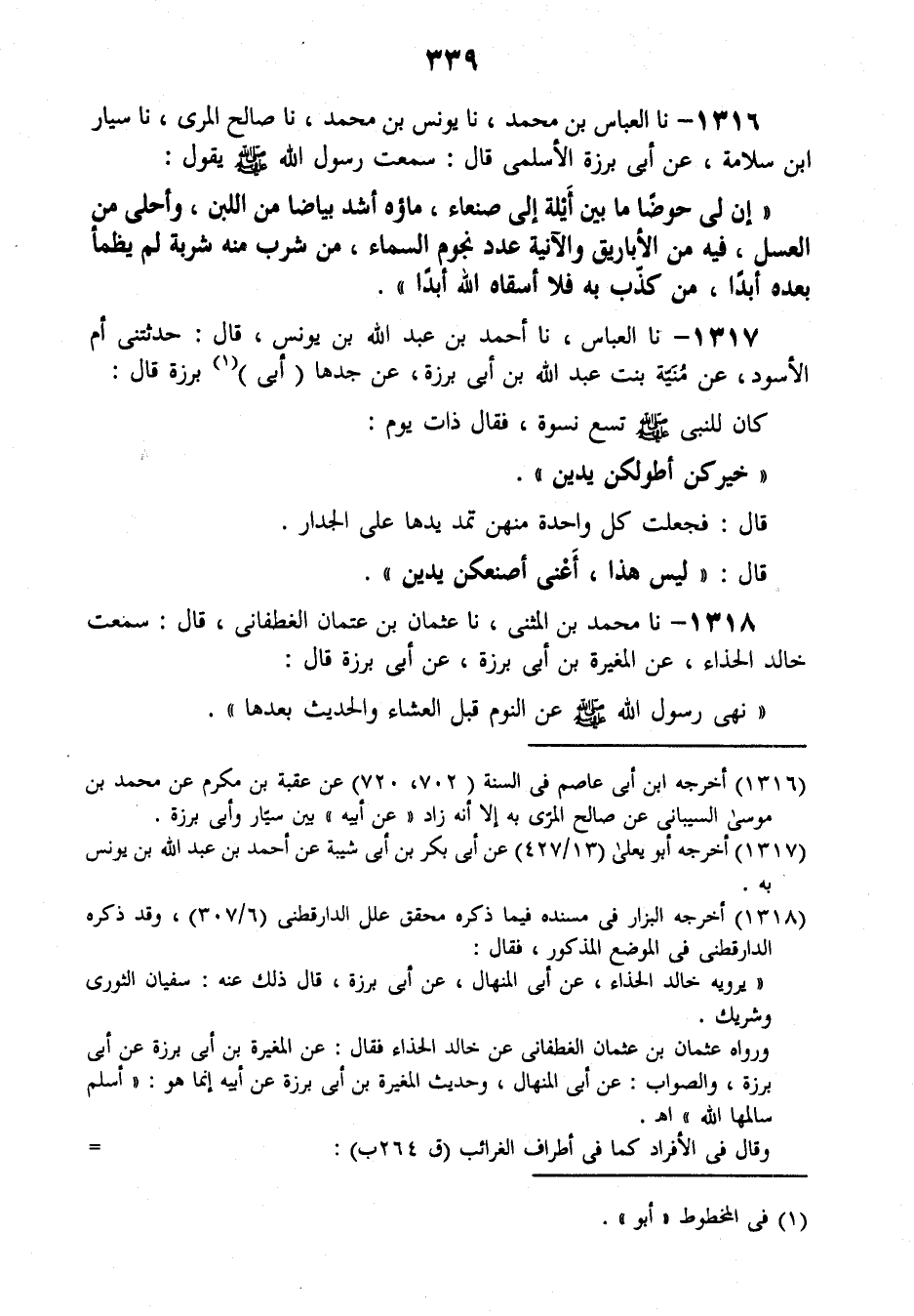1316 - نَا الْعَبَّاسُ بْنُ مُحَمَّدٍ , نَا يُونُسُ بْنُ مُحَمَّدٍ، نَا صَالِحٌ الْمُرِّيُّ، نَا سَيَّارُ بْنُ سَلَامَةَ، عَنْ أَبِي بَرْزَةَ الْأَسْلَمِيِّ قَالَ: سَمِعْتُ رَسُولَ اللَّهِ صَلَّى اللهُ عَلَيْهِ وَسَلَّمَ يَقُولُ: «إِنَّ §لِي حَوْضًا مَا بَيْنَ أَيْلَةَ إِلَى صَنْعَاءَ، مَاؤُهُ أَشَدُّ بَيَاضًا مِنَ اللَّبَنِ، وَأَحْلَى مِنَ الْعَسَلِ، فِيهِ مِنَ الْأَبَارِيقِ وَالْآنِيَةِ عَدَدُ نُجُومِ السَّمَاءِ، مَنْ شَرِبَ مِنْهُ شَرْبَةً لَمْ يَظْمَأْ بَعْدَهُ أَبَدًا، مَنْ كَذَّبَ بِهِ فَلَا أَسْقَاهُ اللَّهُ أَبَدًا»