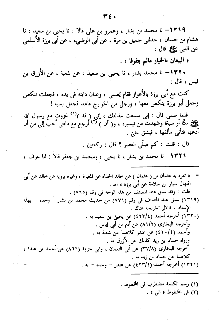 1320 - نَا مُحَمَّدُ بْنُ بَشَّارٍ، نَا يَحْيَى بْنُ سَعِيدٍ، عَنْ شُعْبَةَ، عَنِ الْأَزْرَقِ بْنِ قَيْسٍ , قَالَ: كُنْتُ مَعَ أَبِي بَرْزَةَ بِالْأَهْوَازِ؛ فَقَامَ يُصَلِّي وَعَنَانُ دَابَّتِهِ فِي يَدِهِ فَجَعَلَتْ تَنْكُصُ، وَجَعَلَ أَبُو بَرْزَةَ يَنْكُصُ مَعَهَا، وَرَجُلٌ مِنَ الْخَوَارِجِ قَاعِدٌ فَجَعَلَ يَسُبَّهُ، فَلَمَّا صَلَّى قَالَ: إِنِّي سَمِعْتُ مَقَالَتَكَ، إِنِّي قَدْ غَزَوْتُ مَعَ رَسُولِ اللَّهِ صَلَّى اللهُ عَلَيْهِ وَسَلَّمَ سِتًّا، أَوْ سَبْعًا وَشَهِدْتُ مِنْ تَيْسِيرِهِ، وَأَنْ §أَرْجِعَ مَعَ دَابَّتِي أَحَبُّ إِلَيَّ مِنْ أَنْ أَدَعَهَا فَتَأْتِيَ مَأْلَفَهَا فَيَشُقَّ عَلَيَّ قَالَ: قُلْتُ: كَمْ صَلَّى الْعَصْرَ؟، قَالَ: رَكْعَتَيْنِ