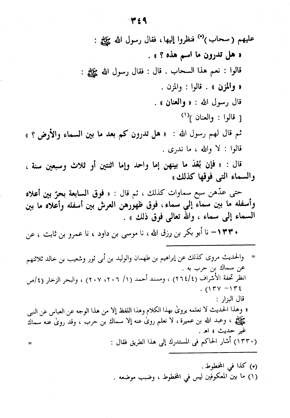 1330 - نَا أَبُو بَكْرِ بْنُ رِزْقِ اللَّهِ , نَا مُوسَى بْنُ دَاوُدَ، نَا عَمْرُو بْنُ ثَابِتٍ، عَنْ سِمَاكِ بْنِ حَرْبٍ، عَنِ الْأَحْنَفِ بْنِ قَيْسٍ , عَنِ الْعَبَّاسِ بْنِ عَبْدِ الْمُطَّلِبِ , قَالَ: ذَكَرَ رَسُولُ اللَّهِ صَلَّى اللهُ عَلَيْهِ وَسَلَّمَ الْعَرْشَ، فَقَالَ: «§تَحْمِلُهُ ثَمَانِيَةُ أَمْلَاكٍ عَلَى خَلْقِ الْأَوْعَالِ، مَا بَيْنَ رُكَبِهِمْ إِلَى أَظْلَافِهِمْ مَسِيرَةُ كَذَا وَكَذَا سَنَةً»