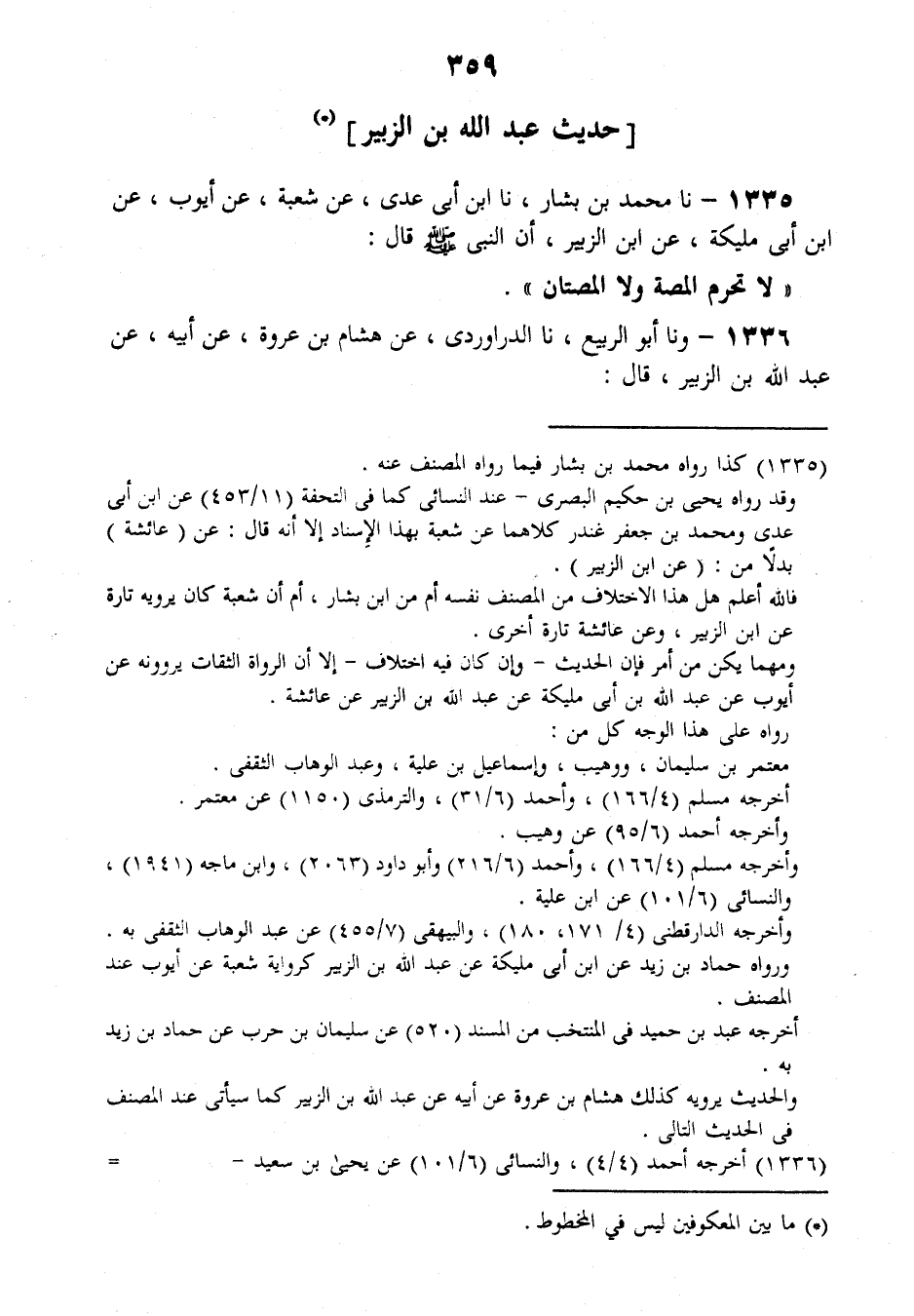1335 - نَا مُحَمَّدُ بْنُ بَشَّارٍ، نَا ابْنُ أَبِي عَدِيٍّ , عَنْ شُعْبَةَ، عَنْ أَيُّوبَ، عَنِ ابْنِ أَبِي مُلَيْكَةَ، عَنِ ابْنِ الزُّبَيْرِ أَنَّ النَّبِيَّ صَلَّى اللهُ عَلَيْهِ وَسَلَّمَ قَالَ: «§لَا تُحَرِّمُ الْمَصَّةُ، وَلَا الْمَصَّتَانِ»