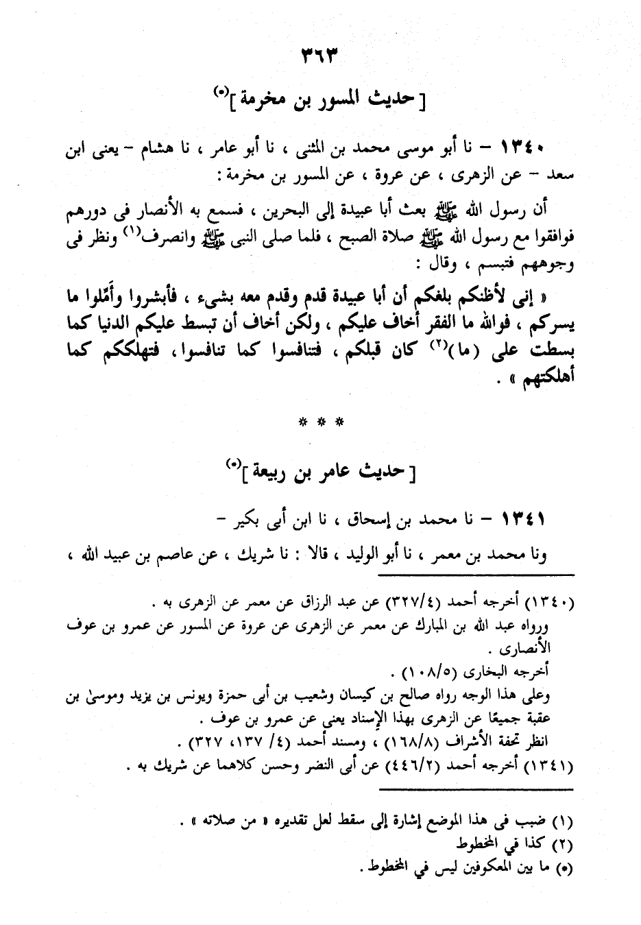1340 - نَا أَبُو مُوسَى مُحَمَّدُ بْنُ الْمُثَنَّى، نَا أَبُو عَامِرٍ , نَا هِشَامٌ يَعْنِي ابْنَ سَعْدٍ، عَنِ الزُّهْرِيِّ , عَنْ عُرْوَةَ، عَنِ الْمِسْوَرِ بْنِ مَخْرَمَةَ أَنَّ رَسُولَ اللَّهِ صَلَّى اللهُ عَلَيْهِ وَسَلَّمَ بَعَثَ أَبَا عُبَيْدَةَ إِلَى الْبَحْرَيْنِ فَسَمِعَ بِهِ الْأَنْصَارُ فِي دُورِهِمْ، فَوَافَقُوا مَعَ رَسُولِ اللَّهِ صَلَّى اللهُ عَلَيْهِ وَسَلَّمَ صَلَاةَ الصُّبْحِ، فَلَمَّا صَلَّى النَّبِيُّ صَلَّى اللهُ عَلَيْهِ وَسَلَّمَ وَانْصَرَفَ وَنَظَرَ فِي وُجُوهِهِمْ فَتَبَسَّمَ، وَقَالَ: «إِنِّي لَأَظُنُّكُمْ بَلَغَكُمْ أَنَّ أَبَا عُبَيْدَةَ قَدِمَ، وَقَدِمَ مَعَهُ بِشَيْءٍ، فَأَبْشِرُوا وَأَمِّلُوا مَا يَسُرُّكُمْ، فَوَاللَّهِ مَا الْفَقْرَ أَخَافُ عَلَيْكُمْ، وَلَكِنْ §أَخَافُ أَنْ تُبْسَطَ عَلَيْكُمُ الدُّنْيَا كَمَا بُسِطَتْ عَلَى مَنْ كَانَ قَبْلَكُمْ، فَتَنَافَسُوا كَمَا تَنَافَسُوا، فَتُهْلِكَكُمْ كَمَا أَهْلَكَتْهُمْ»