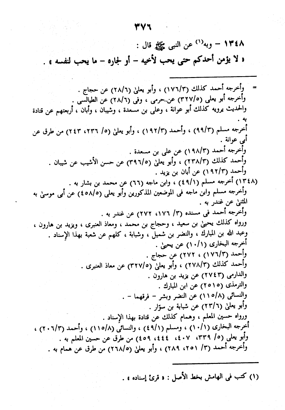 1348 - وَبِهِ عَنِ النَّبِيِّ صَلَّى اللهُ عَلَيْهِ وَسَلَّمَ قَالَ: «§لَا يُؤْمِنُ أَحَدُكُمْ حَتَّى يُحِبَّ لِأَخِيهِ، أَوْ لِجَارِهِ مَا يُحِبُّ لِنَفْسِهِ»
